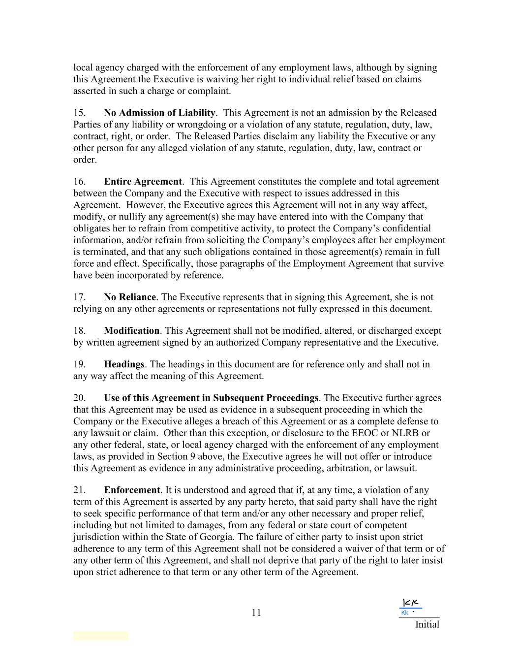 11 ________ Initial local agency charged with the enforcement of any employment laws, although by signing this Agreement the Executive is waiving her right to individual relief based on claims asserted in such a charge or complaint. 15. No Admission of Liability. This Agreement is not an admission by the Released Parties of any liability or wrongdoing or a violation of any statute, regulation, duty, law, contract, right, or order. The Released Parties disclaim any liability the Executive or any other person for any alleged violation of any statute, regulation, duty, law, contract or order. 16. Entire Agreement. This Agreement constitutes the complete and total agreement between the Company and the Executive with respect to issues addressed in this Agreement. However, the Executive agrees this Agreement will not in any way affect, modify, or nullify any agreement(s) she may have entered into with the Company that obligates her to refrain from competitive activity, to protect the Company’s confidential information, and/or refrain from soliciting the Company’s employees after her employment is terminated, and that any such obligations contained in those agreement(s) remain in full force and effect. Specifically, those paragraphs of the Employment Agreement that survive have been incorporated by reference. 17. No Reliance. The Executive represents that in signing this Agreement, she is not relying on any other agreements or representations not fully expressed in this document. 18. Modification. This Agreement shall not be modified, altered, or discharged except by written agreement signed by an authorized Company representative and the Executive. 19. Headings. The headings in this document are for reference only and shall not in any way affect the meaning of this Agreement. 20. Use of this Agreement in Subsequent Proceedings. The Executive further agrees that this Agreement may be used as evidence in a subsequent proceeding in which the Company or the Executive alleges a breach of this Agreement or as a complete defense to any lawsuit or claim. Other than this exception, or disclosure to the EEOC or NLRB or any other federal, state, or local agency charged with the enforcement of any employment laws, as provided in Section 9 above, the Executive agrees he will not offer or introduce this Agreement as evidence in any administrative proceeding, arbitration, or lawsuit. 21. Enforcement. It is understood and agreed that if, at any time, a violation of any term of this Agreement is asserted by any party hereto, that said party shall have the right to seek specific performance of that term and/or any other necessary and proper relief, including but not limited to damages, from any federal or state court of competent jurisdiction within the State of Georgia. The failure of either party to insist upon strict adherence to any term of this Agreement shall not be considered a waiver of that term or of any other term of this Agreement, and shall not deprive that party of the right to later insist upon strict adherence to that term or any other term of the Agreement.