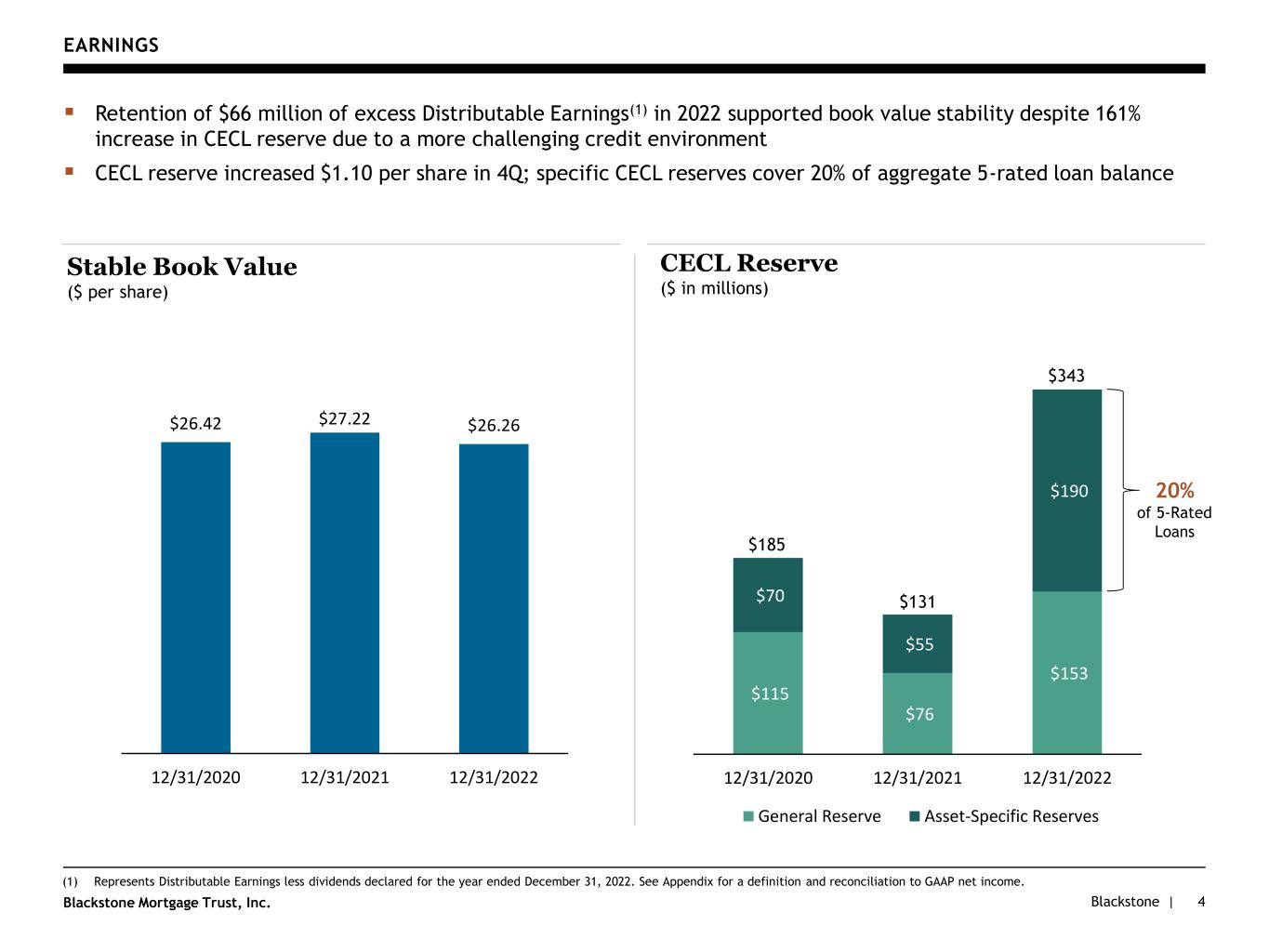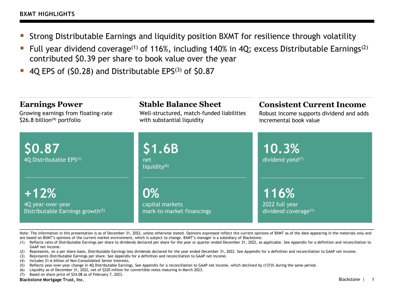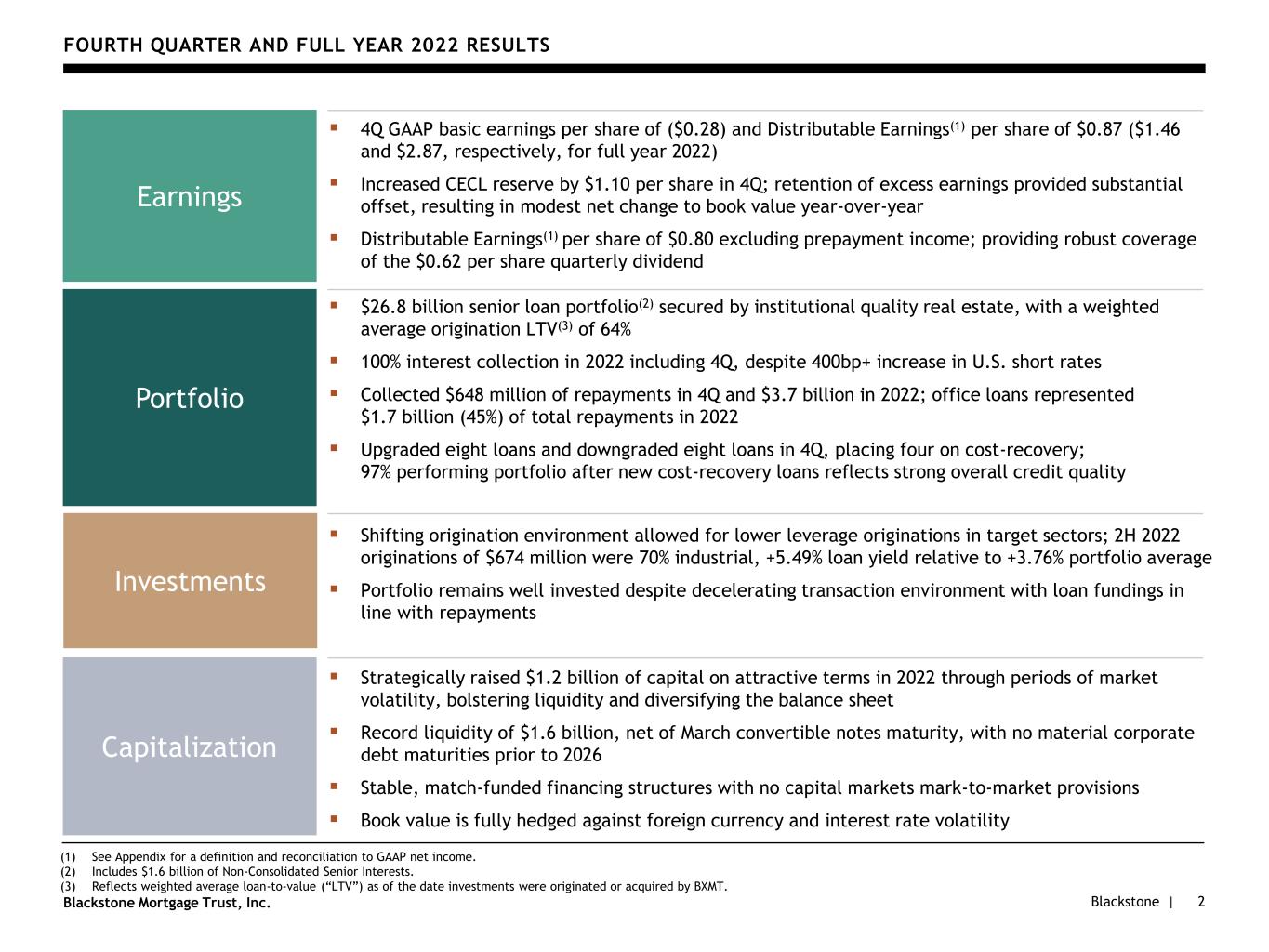 Blackstone |Blackstone Mortgage Trust, Inc. 2 FOURTH QUARTER AND FULL YEAR 2022 RESULTS (1) See Appendix for a definition and reconciliation to GAAP net income. (2) Includes $1.6 billion of Non-Consolidated Senior Interests. (3) Reflects weighted average loan-to-value (“LTV”) as of the date investments were originated or acquired by BXMT. Earnings ▪ 4Q GAAP basic earnings per share of ($0.28) and Distributable Earnings(1) per share of $0.87 ($1.46 and $2.87, respectively, for full year 2022) ▪ Increased CECL reserve by $1.10 per share in 4Q; retention of excess earnings provided substantial offset, resulting in modest net change to book value year-over-year ▪ Distributable Earnings(1) per share of $0.80 excluding prepayment income; providing robust coverage of the $0.62 per share quarterly dividend Portfolio ▪ $26.8 billion senior loan portfolio(2) secured by institutional quality real estate, with a weighted average origination LTV(3) of 64% ▪ 100% interest collection in 2022 including 4Q, despite 400bp+ increase in U.S. short rates ▪ Collected $648 million of repayments in 4Q and $3.7 billion in 2022; office loans represented $1.7 billion (45%) of total repayments in 2022 ▪ Upgraded eight loans and downgraded eight loans in 4Q, placing four on cost-recovery; 97% performing portfolio after new cost-recovery loans reflects strong overall credit quality Investments ▪ Strategically raised $1.2 billion of capital on attractive terms in 2022 through periods of market volatility, bolstering liquidity and diversifying the balance sheet ▪ Record liquidity of $1.6 billion, net of March convertible notes maturity, with no material corporate debt maturities prior to 2026 ▪ Stable, match-funded financing structures with no capital markets mark-to-market provisions ▪ Book value is fully hedged against foreign currency and interest rate volatility Capitalization ▪ Shifting origination environment allowed for lower leverage originations in target sectors; 2H 2022 originations of $674 million were 70% industrial, +5.49% loan yield relative to +3.76% portfolio average ▪ Portfolio remains well invested despite decelerating transaction environment with loan fundings in line with repayments
