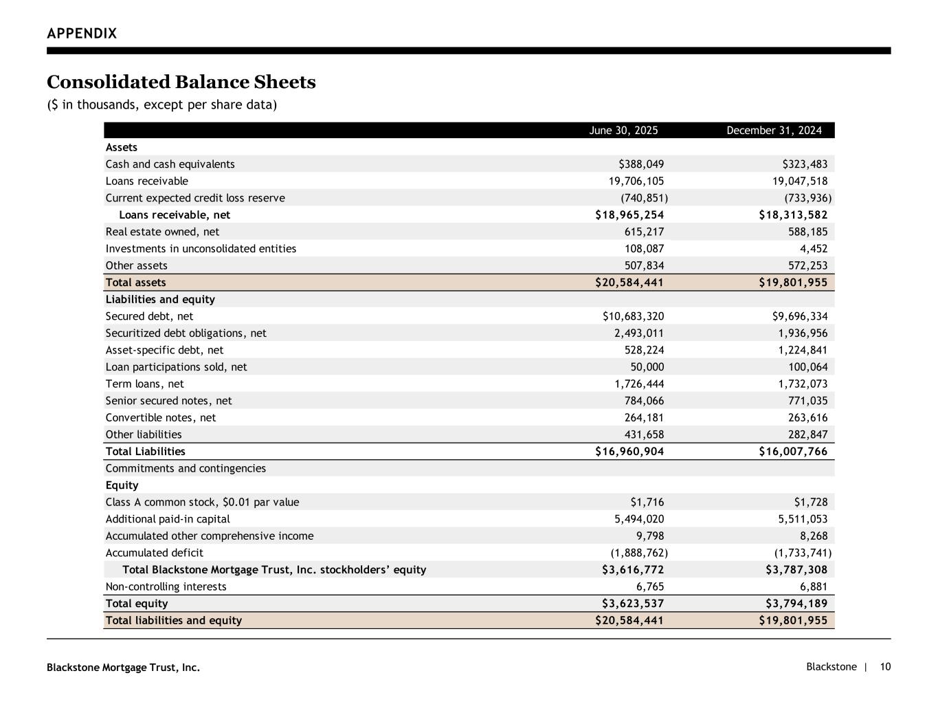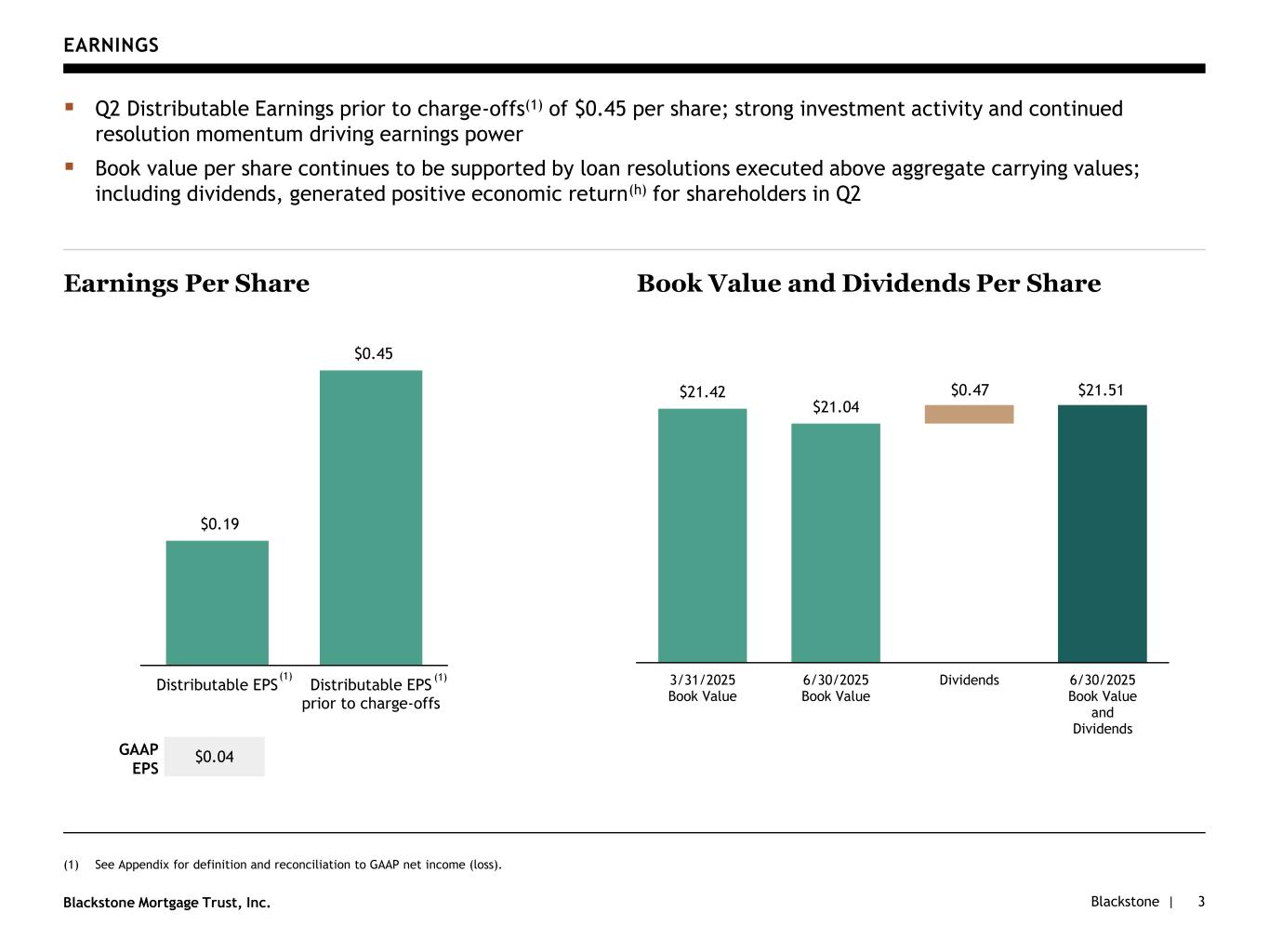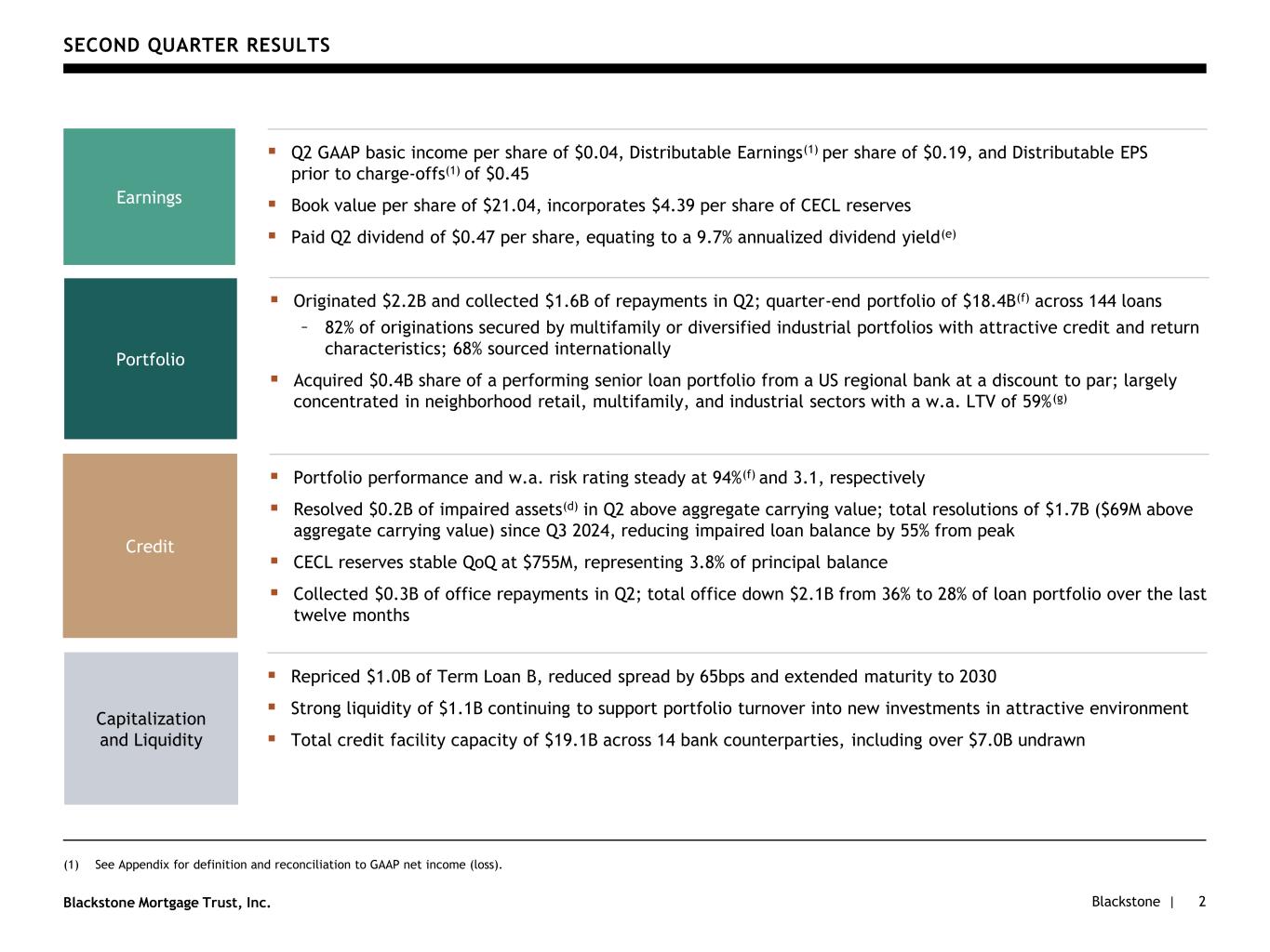 2025年7月30日 (ニューヨーク) -- Blackstone Mortgage Trust, Inc. (NYSE: BXMT) は本日、2025年第2四半期決算を発表しました。当四半期の純利益 (Blackstone Mortgage Trust に帰属) は700万ドルでした。第2四半期のEPSは0.04ドル、分配可能EPSは0.19ドル、償却前分配可能EPSは0.45ドル、基本株1株当たりの配当金は0.47ドルでした。