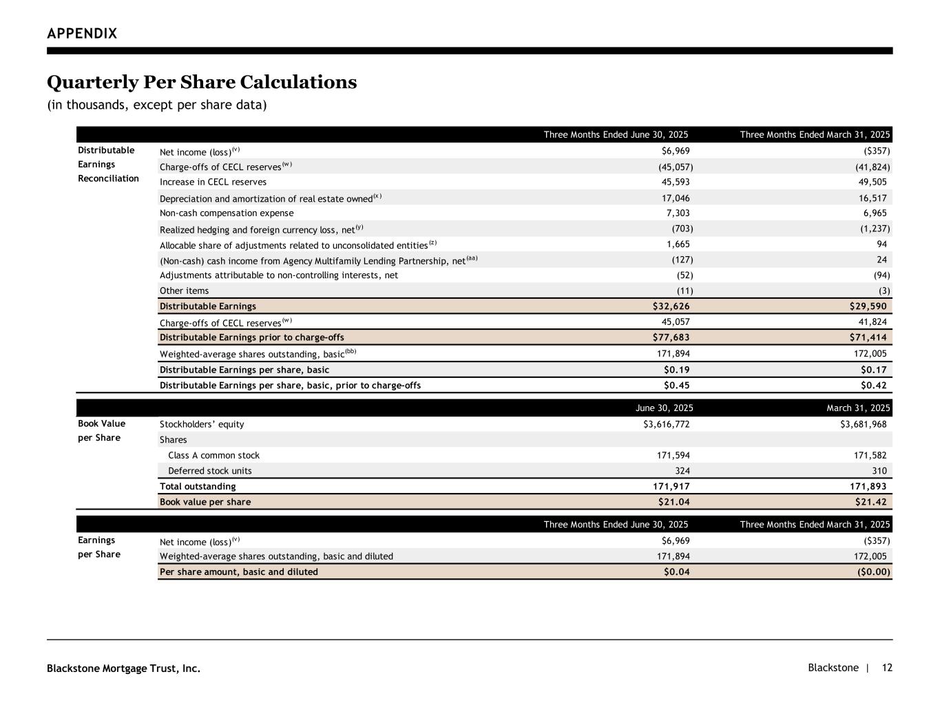 本プレスリリースでは、非 GAAP 財務指標である「分配可能 EPS」および「償却前分配可能 EPS」を参照しています。最も直接的に比較可能な GAAP 指標である Blackstone Mortgage Trust に帰属する純利益 (損失) への調整は、2025年度第2四半期決算の詳細プレゼンテーションに含まれており、当社ウェブサイト www.bxmt.com でご覧いただけます。