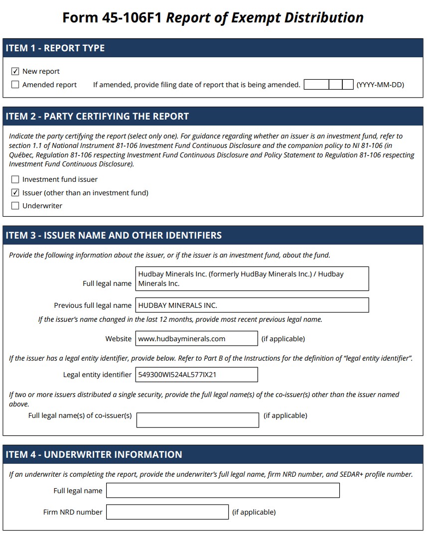 If “Yes” is marked, indicate below the file number assigned to the registrant in connection with Rule 12g3-2(b): 82- _____________________________ On December 18, 2024, Hudbay Minerals Inc. (“Hudbay”) filed on the Canadian Securities Administrators’ System for Electronic Document Analysis and Retrieval (SEDAR) website at www.sedarplus.ca the following documents: (1) Form 45-106F1 Report of Exempt Distribution.