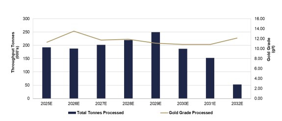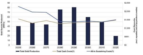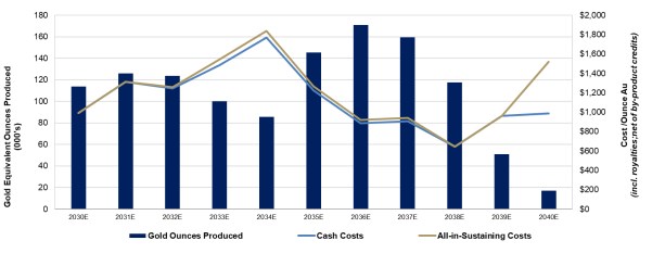 The PEA estimates cash costs(1) of $1,185 per ounce of gold and all-in sustaining costs(1) of $1,225 per ounce of gold for the LOM (see Table 5). Figure 6 illustrates these operating costs over the Project's estimated production profile.