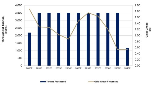 The Project's process design includes primary crushing via a large jaw crusher with an intermediate stockpile. The crushed material is fed to a sag and ball mill circuit consisting of a semi-autogenous ("SAG") mill in closed circuit with a ball mill. Pebble crushing has not been included at this stage. The target throughput is 10,000 tonnes per day at a 90% availability. The ground material is directed to a thickener and the thickener underflow to the CIL tanks.