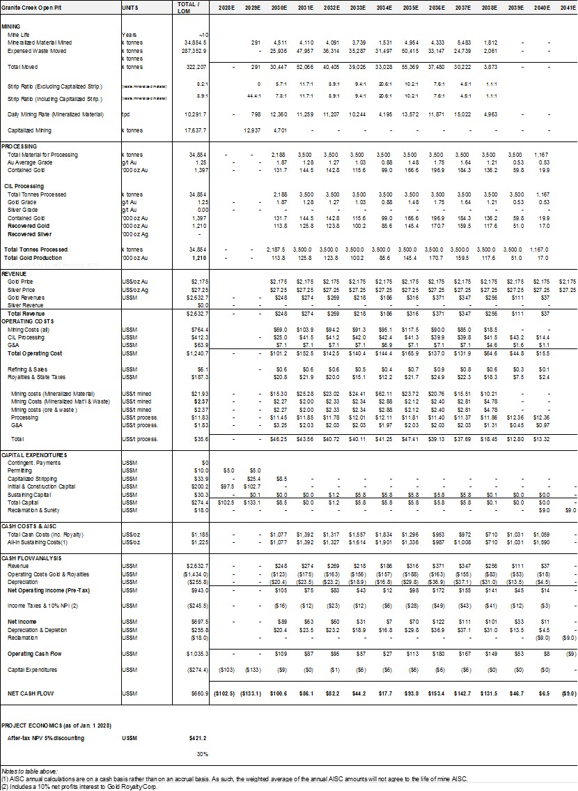 The PEA demonstrates an initial mine life of approximately 10 years with an annual gold production of approximately 130,000 ounces following production ramp up. The PEA represents a preliminary point-in-time estimate of the mine plan. The previous preliminary economic assessment released on Granite Creek in 2021, envisioned a predominately heap leach operation with a small-scale CIL plant for Granite Creek open pit. Further work and higher gold prices have demonstrated better economics by migrating to a full CIL scenario.