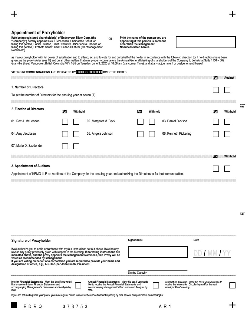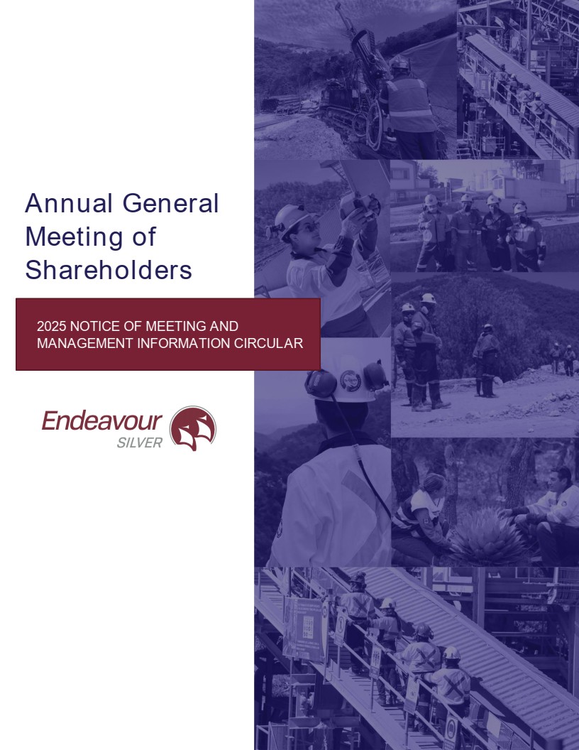 This Notice of Meeting, the Information Circular and other Meeting materials will be available on Endeavour Silver's website at https://edrsilver.com/t/investor-disclosure/ and under Endeavour Silver's profile on SEDAR+ at www.sedarplus.ca and EDGAR at www.sec.gov/edgar as of April 25, 2025, and will remain on the website for one full year thereafter. Meeting materials are also available upon request, without charge, by email at info@edrsilver.com or by calling toll free at 1 877 685 9775 (Canada and U.S.A.) or at +1 604 685 9775.