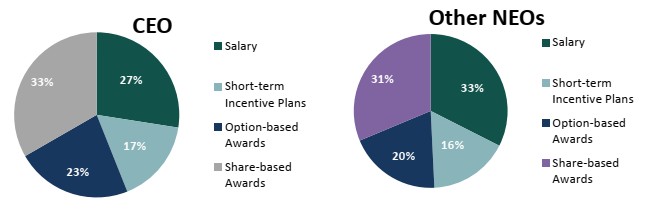 In support of the Company's goal of aligning director and shareholder interests and discourage undue and excessive risk, all the Company's directors must meet minimum share ownership requirements. The required holdings may be satisfied through holdings of Common Shares or outstanding DSUs. The director share ownership guideline is to maintain the guideline amount at three times the directors' annual retainer. The directors must acquire at least C$195,000 in Common Shares and/or DSUs within five years of being elected.