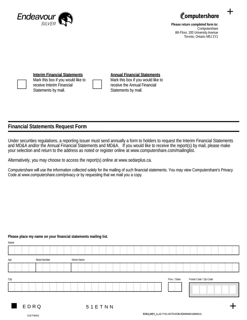 Shareholders may make their request without charge by email at info@edrsilver.com or by calling toll free number 1-877-685-9775 (Canada and United States) or at +1-604-685-9775.