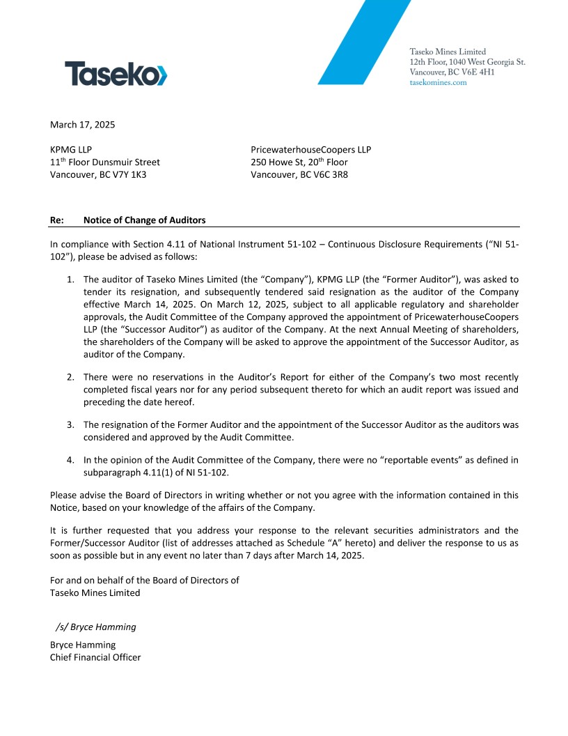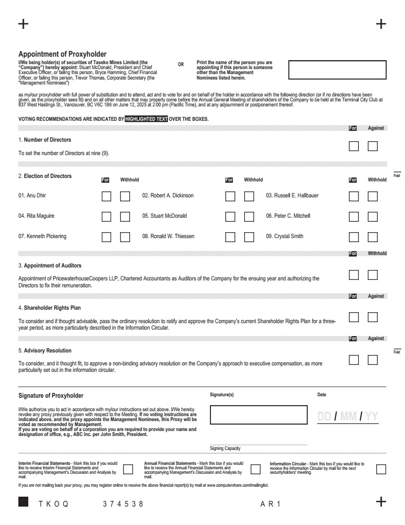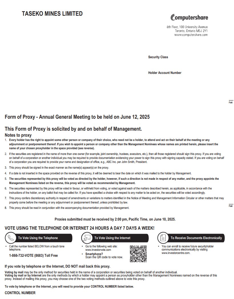 You are receiving this notification because Taseko Mines Limited (the "Company" or "Taseko") has decided to use the notice and access model for the delivery of meeting materials to its shareholders in respect of its Annual General Meeting of Shareholders to be held on Thursday, June 12, 2025 (the "Meeting"). Under notice and access provisions, instead of receiving paper copies of the Company's Notice of Annual General Meeting and Information Circular (together, the "Information Circular") shareholders are receiving this Notice and Access Notification ("notification") with information on how to access the Information Circular electronically. Digital copies of the Information Circular and the form of Proxy for the Meeting (collectively, the "Proxy Materials") will be posted online, together with a copy of this notification. Shareholders are also receiving a paper copy of the proxy or voting instruction form, as applicable, enabling them to vote by proxy in advance of the Meeting. This method of delivery is an environmentally responsible, cost-effective way to deliver Proxy Materials to the Company's shareholders.