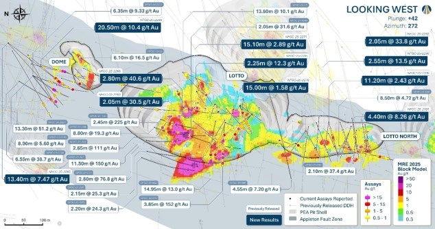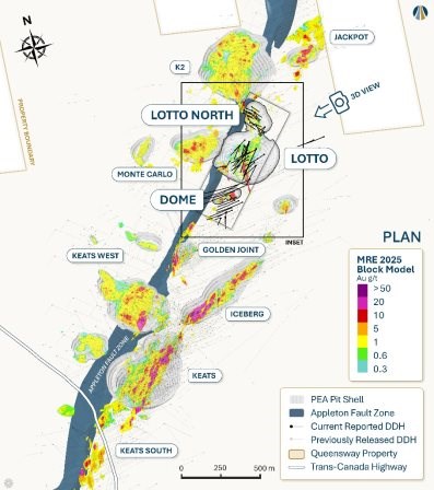 This news release includes results from 11,187 m of drilling in 79 diamond drill holes ("DDH") completed in Q3/25 as part of an infill and exploration program at AFZ Core (Tables 1 to 3). The results reported herein include step-out drilling at Dome targeting new high-grade mineralization discovered in Q4/25 at depth below the Preliminary Economic Assessment ("PEA") pit shell (see the New Found Gold news releases dated February 24, 2025 and April 29, 2025), as well as infill drilling of the Lotto and Lotto North PEA pit shell (Figure 1). The objective of the Lotto and Lotto North drilling is to convert inferred mineral resources to the indicated category included in the Phase 1 Queensway PEA mine plan (see the New Found Gold news release dated July 21, 2025).