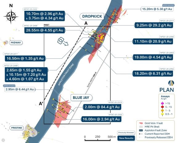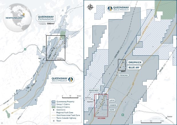Melissa Render, President of New Found Gold stated: "In late 2024, we made a high-grade discovery at Dropkick in the AFZ Peripheral area at Queensway. Initial 2025 drill results have expanded the mineralized footprint at Dropkick to 815 m along strike and to a depth of 285 m. Importantly, the zone remains open along strike and to depth. New results confirm the presence of high-grade mineralization and current exploration is focused on its expansion.