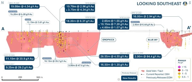 These intercepts occur in the southwest extent of the Dropkick fault zone in a domain of high-grade mineralization discovered in Q4/24. Continued exploration drilling in 2025 has successfully extended the high-grade mineralization from surface to a vertical depth of 285 m and across a strike length of 75 m (Figures 2 and 3). Ongoing step-out drilling both on the northern and southern boundaries has expanded mineralization associated with the Dropkick fault zone across a strike length of 815 m.