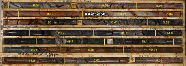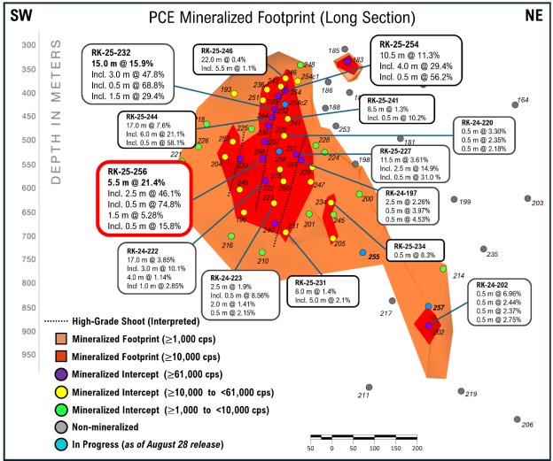 Significantly, this high-grade uranium intersection in RK-25-256 is 119 m down-dip of drill hole RK-25-232, and an additional 51 m down-dip of recently reported (see news release dated November 12, 2025) RK-25-254 (Figure 1 and 3). Overall, intense high-grade uranium mineralization is currently interpreted along a minimum of 215 m of dip extent from RK-25-254 to RK-24-222.