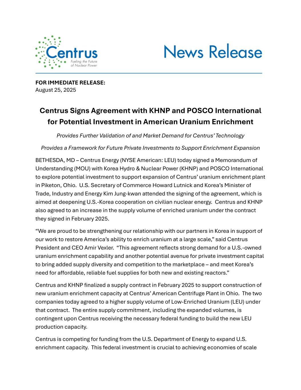 FOR IMMEDIATE RELEASE: August 25, 2025 Centrus Signs Agreement with KHNP and POSCO International for Potential Investment in American Uranium Enrichment Provides Further Validation of and Market Demand for Centrus’ Technology Provides a Framework for Future Private Investments to Support Enrichment Expansion BETHESDA, MD – Centrus Energy (NYSE American: LEU) today signed a Memorandum of Understanding (MOU) with Korea Hydro & Nuclear Power (KHNP) and POSCO International to explore potential investment to support expansion of Centrus’ uranium enrichment plant in Piketon, Ohio. U.S. Secretary of Commerce Howard Lutnick and Korea’s Minister of Trade, Industry and Energy Kim Jung-kwan attended the signing of the agreement, which is aimed at deepening U.S.-Korea cooperation on civilian nuclear energy. Centrus and KHNP also agreed to an increase in the supply volume of enriched uranium under the contract they signed in February 2025. “We are proud to be strengthening our relationship with our partners in Korea in support of our work to restore America’s ability to enrich uranium at a large scale,” said Centrus President and CEO Amir Vexler. “This agreement reflects strong demand for a U.S.-owned uranium enrichment capability and another potential avenue for private investment capital to bring added supply diversity and competition to the marketplace – and meet Korea’s need for affordable, reliable fuel supplies for both new and existing reactors.” Centrus and KHNP finalized a supply contract in February 2025 to support construction of new uranium enrichment capacity at Centrus’ American Centrifuge Plant in Ohio. The two companies today agreed to a higher supply volume of Low-Enriched Uranium (LEU) under that contract. The entire supply commitment, including the expanded volumes, is contingent upon Centrus receiving the necessary federal funding to build the new LEU production capacity. Centrus is competing for funding from the U.S. Department of Energy to expand U.S. enrichment capacity. This federal investment is crucial to achieving economies of scale