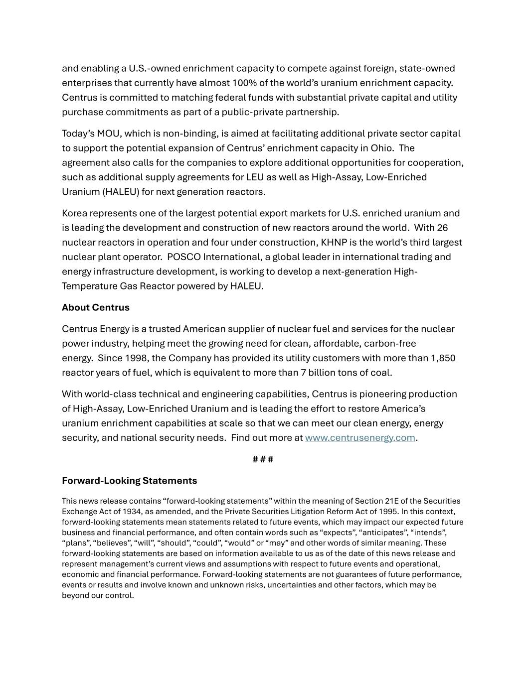 and enabling a U.S.-owned enrichment capacity to compete against foreign, state-owned enterprises that currently have almost 100% of the world’s uranium enrichment capacity. Centrus is committed to matching federal funds with substantial private capital and utility purchase commitments as part of a public-private partnership. Today’s MOU, which is non-binding, is aimed at facilitating additional private sector capital to support the potential expansion of Centrus’ enrichment capacity in Ohio. The agreement also calls for the companies to explore additional opportunities for cooperation, such as additional supply agreements for LEU as well as High-Assay, Low-Enriched Uranium (HALEU) for next generation reactors. Korea represents one of the largest potential export markets for U.S. enriched uranium and is leading the development and construction of new reactors around the world. With 26 nuclear reactors in operation and four under construction, KHNP is the world’s third largest nuclear plant operator. POSCO International, a global leader in international trading and energy infrastructure development, is working to develop a next-generation High- Temperature Gas Reactor powered by HALEU. About Centrus Centrus Energy is a trusted American supplier of nuclear fuel and services for the nuclear power industry, helping meet the growing need for clean, affordable, carbon-free energy. Since 1998, the Company has provided its utility customers with more than 1,850 reactor years of fuel, which is equivalent to more than 7 billion tons of coal. With world-class technical and engineering capabilities, Centrus is pioneering production of High-Assay, Low-Enriched Uranium and is leading the effort to restore America’s uranium enrichment capabilities at scale so that we can meet our clean energy, energy security, and national security needs. Find out more at www.centrusenergy.com. # # # Forward-Looking Statements This news release contains “forward-looking statements” within the meaning of Section 21E of the Securities Exchange Act of 1934, as amended, and the Private Securities Litigation Reform Act of 1995. In this context, forward-looking statements mean statements related to future events, which may impact our expected future business and financial performance, and often contain words such as “expects”, “anticipates”, “intends”, “plans”, “believes”, “will”, “should”, “could”, “would” or “may” and other words of similar meaning. These forward-looking statements are based on information available to us as of the date of this news release and represent management’s current views and assumptions with respect to future events and operational, economic and financial performance. Forward-looking statements are not guarantees of future performance, events or results and involve known and unknown risks, uncertainties and other factors, which may be beyond our control.