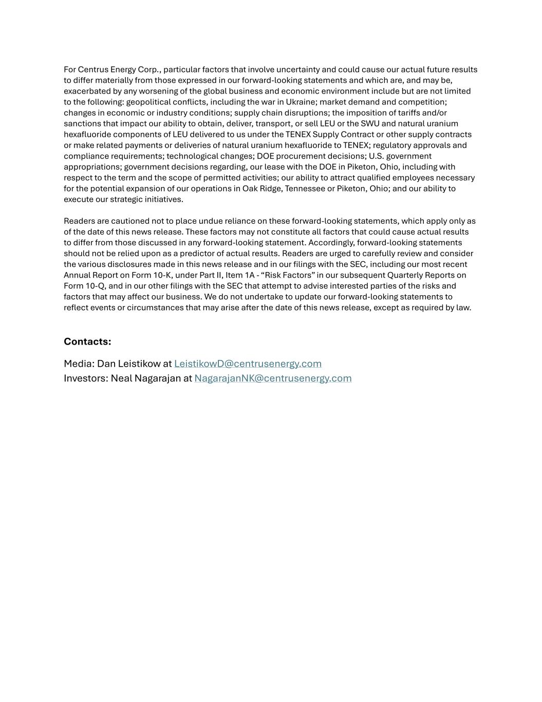 For Centrus Energy Corp., particular factors that involve uncertainty and could cause our actual future results to differ materially from those expressed in our forward-looking statements and which are, and may be, exacerbated by any worsening of the global business and economic environment include but are not limited to the following: geopolitical conflicts, including the war in Ukraine; market demand and competition; changes in economic or industry conditions; supply chain disruptions; the imposition of tariffs and/or sanctions that impact our ability to obtain, deliver, transport, or sell LEU or the SWU and natural uranium hexafluoride components of LEU delivered to us under the TENEX Supply Contract or other supply contracts or make related payments or deliveries of natural uranium hexafluoride to TENEX; regulatory approvals and compliance requirements; technological changes; DOE procurement decisions; U.S. government appropriations; government decisions regarding, our lease with the DOE in Piketon, Ohio, including with respect to the term and the scope of permitted activities; our ability to attract qualified employees necessary for the potential expansion of our operations in Oak Ridge, Tennessee or Piketon, Ohio; and our ability to execute our strategic initiatives. Readers are cautioned not to place undue reliance on these forward-looking statements, which apply only as of the date of this news release. These factors may not constitute all factors that could cause actual results to differ from those discussed in any forward-looking statement. Accordingly, forward-looking statements should not be relied upon as a predictor of actual results. Readers are urged to carefully review and consider the various disclosures made in this news release and in our filings with the SEC, including our most recent Annual Report on Form 10-K, under Part II, Item 1A - “Risk Factors” in our subsequent Quarterly Reports on Form 10-Q, and in our other filings with the SEC that attempt to advise interested parties of the risks and factors that may affect our business. We do not undertake to update our forward-looking statements to reflect events or circumstances that may arise after the date of this news release, except as required by law. Contacts: Media: Dan Leistikow at LeistikowD@centrusenergy.com Investors: Neal Nagarajan at NagarajanNK@centrusenergy.com