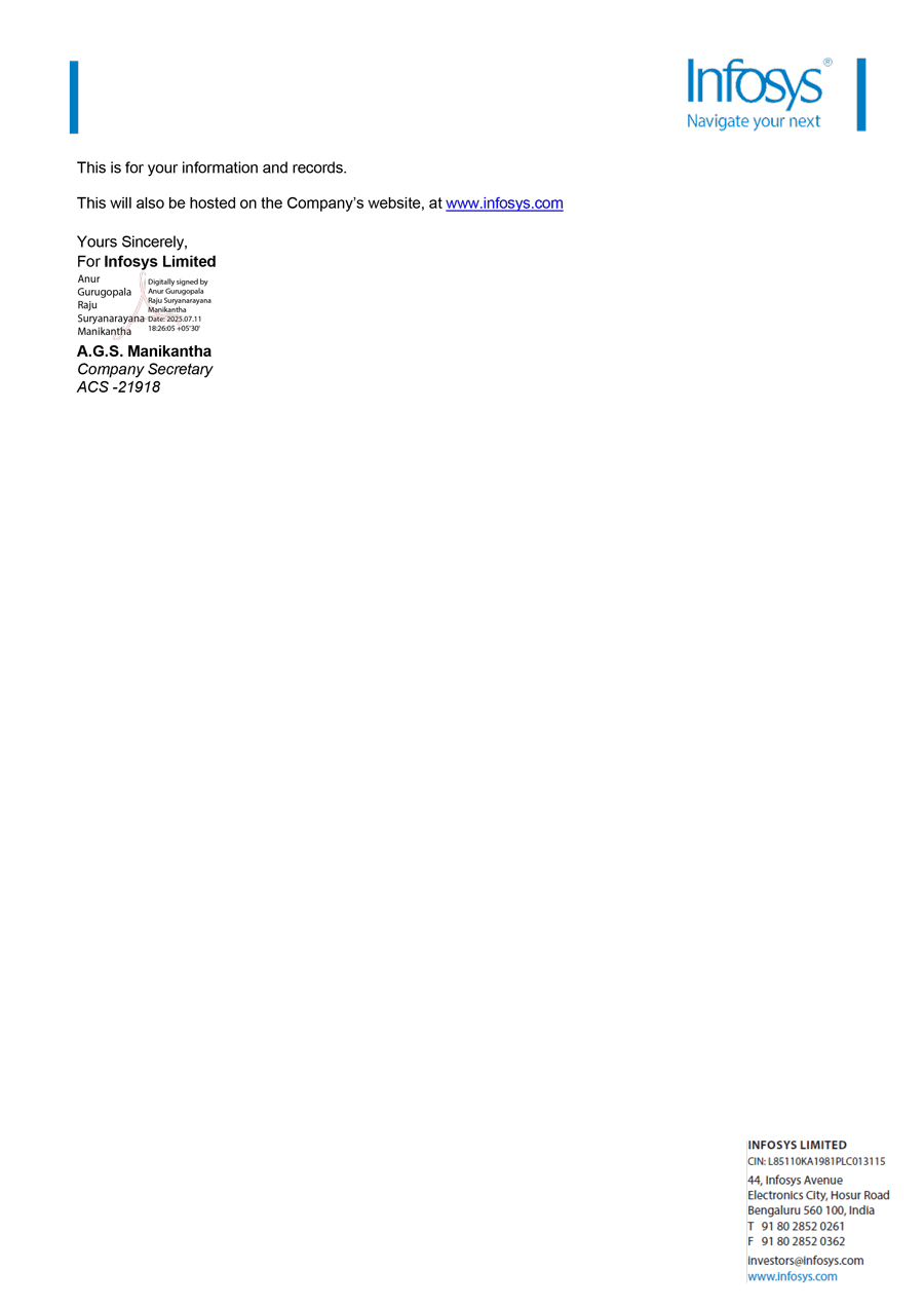 A copy of the intimation as disseminated by Infosys Limited to the stock exchanges in this regard is attached to this Form 6-K as Exhibit 99.1
