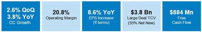 Bengaluru, India – July 23, 2025: Infosys (NSE, BSE, NYSE: INFY), a global leader in next-generation digital services and consulting, delivered $4,941 million in Q1 revenues, year on year growth of 3.8% and sequential growth of 2.6% in constant currency. Operating margin was at 20.8%. Free cash flow generation was strong at $884 million, 109.3% of net profit. TCV of large deal wins was $3.8 billion, with 55% net new. ROE improved by 140 bps to 30.4%.