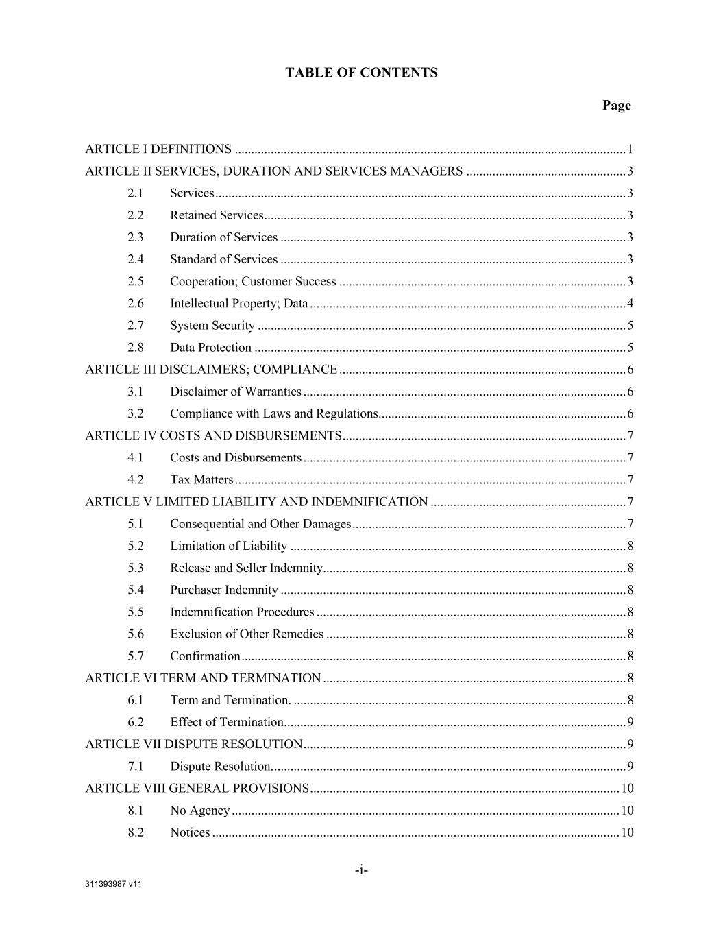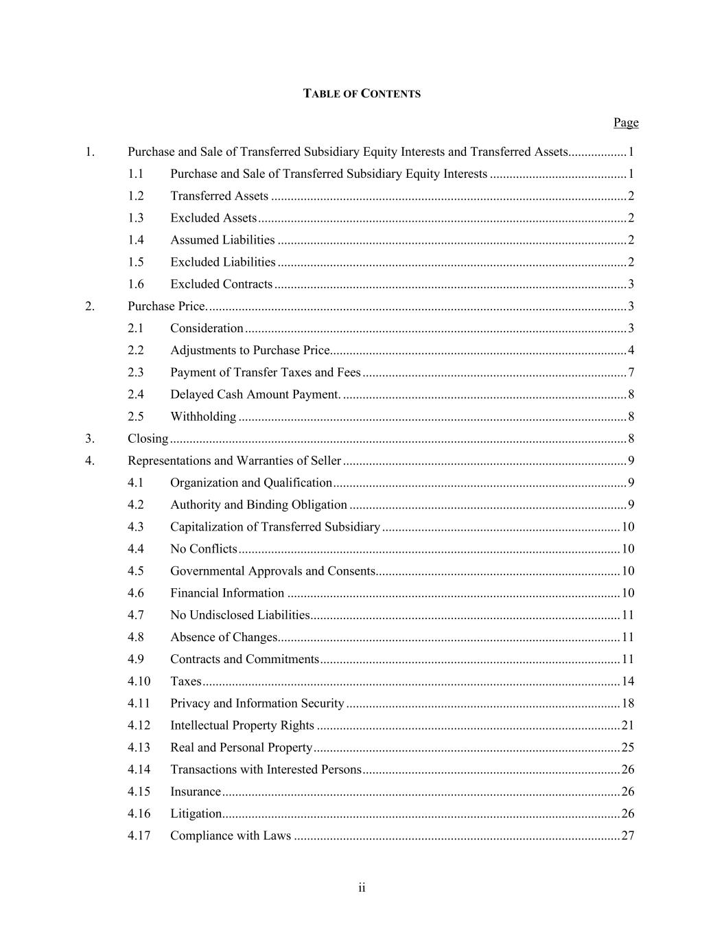 ii TABLE OF CONTENTS Page 1. Purchase and Sale of Transferred Subsidiary Equity Interests and Transferred Assets. ................. 1 1.1 Purchase and Sale of Transferred Subsidiary Equity Interests .......................................... 1 1.2 Transferred Assets ............................................................................................................. 2 1.3 Excluded Assets ................................................................................................................. 2 1.4 Assumed Liabilities ........................................................................................................... 2 1.5 Excluded Liabilities ........................................................................................................... 2 1.6 Excluded Contracts ............................................................................................................ 3 2. Purchase Price. ................................................................................................................................ 3 2.1 Consideration ..................................................................................................................... 3 2.2 Adjustments to Purchase Price........................................................................................... 4 2.3 Payment of Transfer Taxes and Fees ................................................................................. 7 2.4 Delayed Cash Amount Payment. ....................................................................................... 8 2.5 Withholding ....................................................................................................................... 8 3. Closing ............................................................................................................................................ 8 4. Representations and Warranties of Seller ....................................................................................... 9 4.1 Organization and Qualification .......................................................................................... 9 4.2 Authority and Binding Obligation ..................................................................................... 9 4.3 Capitalization of Transferred Subsidiary ......................................................................... 10 4.4 No Conflicts ..................................................................................................................... 10 4.5 Governmental Approvals and Consents ........................................................................... 10 4.6 Financial Information ...................................................................................................... 10 4.7 No Undisclosed Liabilities ............................................................................................... 11 4.8 Absence of Changes ......................................................................................................... 11 4.9 Contracts and Commitments ............................................................................................ 11 4.10 Taxes ................................................................................................................................ 14 4.11 Privacy and Information Security .................................................................................... 18 4.12 Intellectual Property Rights ............................................................................................. 21 4.13 Real and Personal Property .............................................................................................. 25 4.14 Transactions with Interested Persons ............................................................................... 26 4.15 Insurance .......................................................................................................................... 26 4.16 Litigation .......................................................................................................................... 26 4.17 Compliance with Laws .................................................................................................... 27