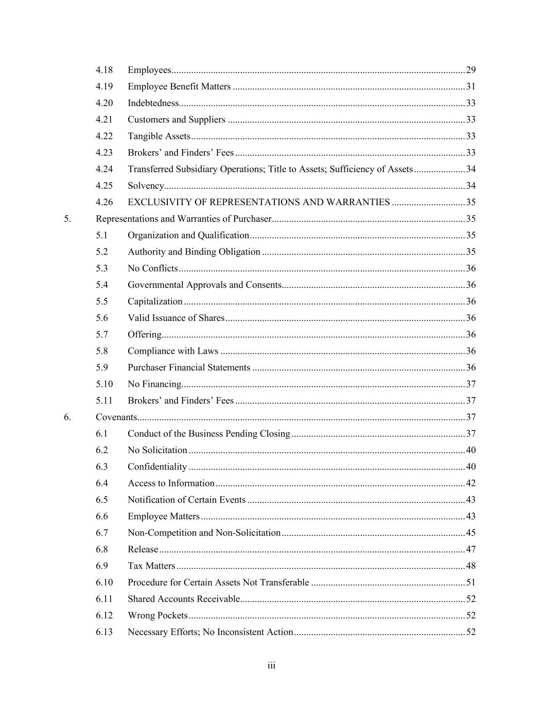 iii 4.18 Employees ........................................................................................................................ 29 4.19 Employee Benefit Matters ............................................................................................... 31 4.20 Indebtedness..................................................................................................................... 33 4.21 Customers and Suppliers ................................................................................................. 33 4.22 Tangible Assets ................................................................................................................ 33 4.23 Brokers’ and Finders’ Fees .............................................................................................. 33 4.24 Transferred Subsidiary Operations; Title to Assets; Sufficiency of Assets ..................... 34 4.25 Solvency........................................................................................................................... 34 4.26 EXCLUSIVITY OF REPRESENTATIONS AND WARRANTIES .............................. 35 5. Representations and Warranties of Purchaser ............................................................................... 35 5.1 Organization and Qualification ........................................................................................ 35 5.2 Authority and Binding Obligation ................................................................................... 35 5.3 No Conflicts ..................................................................................................................... 36 5.4 Governmental Approvals and Consents ........................................................................... 36 5.5 Capitalization ................................................................................................................... 36 5.6 Valid Issuance of Shares .................................................................................................. 36 5.7 Offering ............................................................................................................................ 36 5.8 Compliance with Laws .................................................................................................... 36 5.9 Purchaser Financial Statements ....................................................................................... 36 5.10 No Financing.................................................................................................................... 37 5.11 Brokers’ and Finders’ Fees .............................................................................................. 37 6. Covenants ...................................................................................................................................... 37 6.1 Conduct of the Business Pending Closing ....................................................................... 37 6.2 No Solicitation ................................................................................................................. 40 6.3 Confidentiality ................................................................................................................. 40 6.4 Access to Information ...................................................................................................... 42 6.5 Notification of Certain Events ......................................................................................... 43 6.6 Employee Matters ............................................................................................................ 43 6.7 Non-Competition and Non-Solicitation ........................................................................... 45 6.8 Release ............................................................................................................................. 47 6.9 Tax Matters ...................................................................................................................... 48 6.10 Procedure for Certain Assets Not Transferable ............................................................... 51 6.11 Shared Accounts Receivable............................................................................................ 52 6.12 Wrong Pockets ................................................................................................................. 52 6.13 Necessary Efforts; No Inconsistent Action ...................................................................... 52