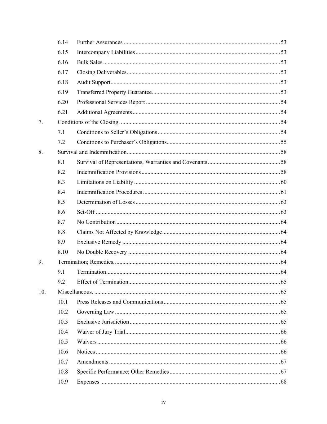 iv 6.14 Further Assurances .......................................................................................................... 53 6.15 Intercompany Liabilities .................................................................................................. 53 6.16 Bulk Sales ........................................................................................................................ 53 6.17 Closing Deliverables ........................................................................................................ 53 6.18 Audit Support ................................................................................................................... 53 6.19 Transferred Property Guarantee ....................................................................................... 53 6.20 Professional Services Report ........................................................................................... 54 6.21 Additional Agreements .................................................................................................... 54 7. Conditions of the Closing. ............................................................................................................ 54 7.1 Conditions to Seller’s Obligations ................................................................................... 54 7.2 Conditions to Purchaser’s Obligations ............................................................................. 55 8. Survival and Indemnification. ....................................................................................................... 58 8.1 Survival of Representations, Warranties and Covenants ................................................. 58 8.2 Indemnification Provisions .............................................................................................. 58 8.3 Limitations on Liability ................................................................................................... 60 8.4 Indemnification Procedures ............................................................................................. 61 8.5 Determination of Losses .................................................................................................. 63 8.6 Set-Off ............................................................................................................................. 63 8.7 No Contribution ............................................................................................................... 64 8.8 Claims Not Affected by Knowledge ................................................................................ 64 8.9 Exclusive Remedy ........................................................................................................... 64 8.10 No Double Recovery ....................................................................................................... 64 9. Termination; Remedies. ................................................................................................................ 64 9.1 Termination ...................................................................................................................... 64 9.2 Effect of Termination ....................................................................................................... 65 10. Miscellaneous. .............................................................................................................................. 65 10.1 Press Releases and Communications ............................................................................... 65 10.2 Governing Law ................................................................................................................ 65 10.3 Exclusive Jurisdiction ...................................................................................................... 65 10.4 Waiver of Jury Trial ......................................................................................................... 66 10.5 Waivers ............................................................................................................................ 66 10.6 Notices ............................................................................................................................. 66 10.7 Amendments .................................................................................................................... 67 10.8 Specific Performance; Other Remedies ........................................................................... 67 10.9 Expenses .......................................................................................................................... 68