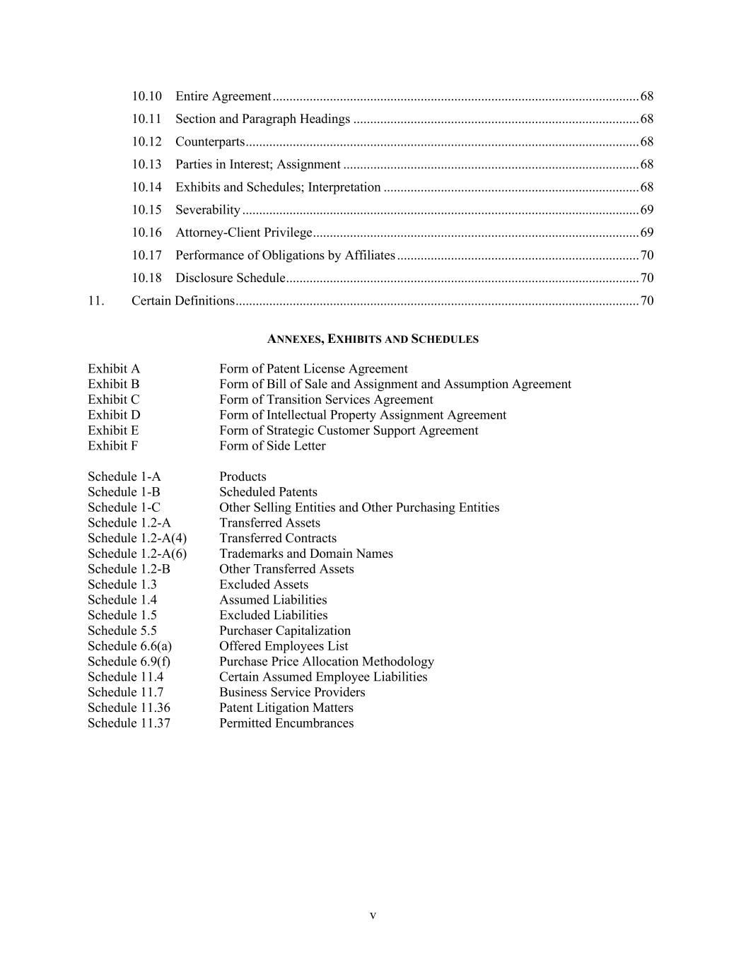 v 10.10 Entire Agreement ............................................................................................................. 68 10.11 Section and Paragraph Headings ..................................................................................... 68 10.12 Counterparts ..................................................................................................................... 68 10.13 Parties in Interest; Assignment ........................................................................................ 68 10.14 Exhibits and Schedules; Interpretation ............................................................................ 68 10.15 Severability ...................................................................................................................... 69 10.16 Attorney-Client Privilege ................................................................................................. 69 10.17 Performance of Obligations by Affiliates ........................................................................ 70 10.18 Disclosure Schedule ......................................................................................................... 70 11. Certain Definitions ........................................................................................................................ 70 ANNEXES, EXHIBITS AND SCHEDULES Exhibit A Form of Patent License Agreement Exhibit B Form of Bill of Sale and Assignment and Assumption Agreement Exhibit C Form of Transition Services Agreement Exhibit D Form of Intellectual Property Assignment Agreement Exhibit E Form of Strategic Customer Support Agreement Exhibit F Form of Side Letter Schedule 1-A Products Schedule 1-B Scheduled Patents Schedule 1-C Other Selling Entities and Other Purchasing Entities Schedule 1.2-A Transferred Assets Schedule 1.2-A(4) Transferred Contracts Schedule 1.2-A(6) Trademarks and Domain Names Schedule 1.2-B Other Transferred Assets Schedule 1.3 Excluded Assets Schedule 1.4 Assumed Liabilities Schedule 1.5 Excluded Liabilities Schedule 5.5 Purchaser Capitalization Schedule 6.6(a) Offered Employees List Schedule 6.9(f) Purchase Price Allocation Methodology Schedule 11.4 Certain Assumed Employee Liabilities Schedule 11.7 Business Service Providers Schedule 11.36 Patent Litigation Matters Schedule 11.37 Permitted Encumbrances