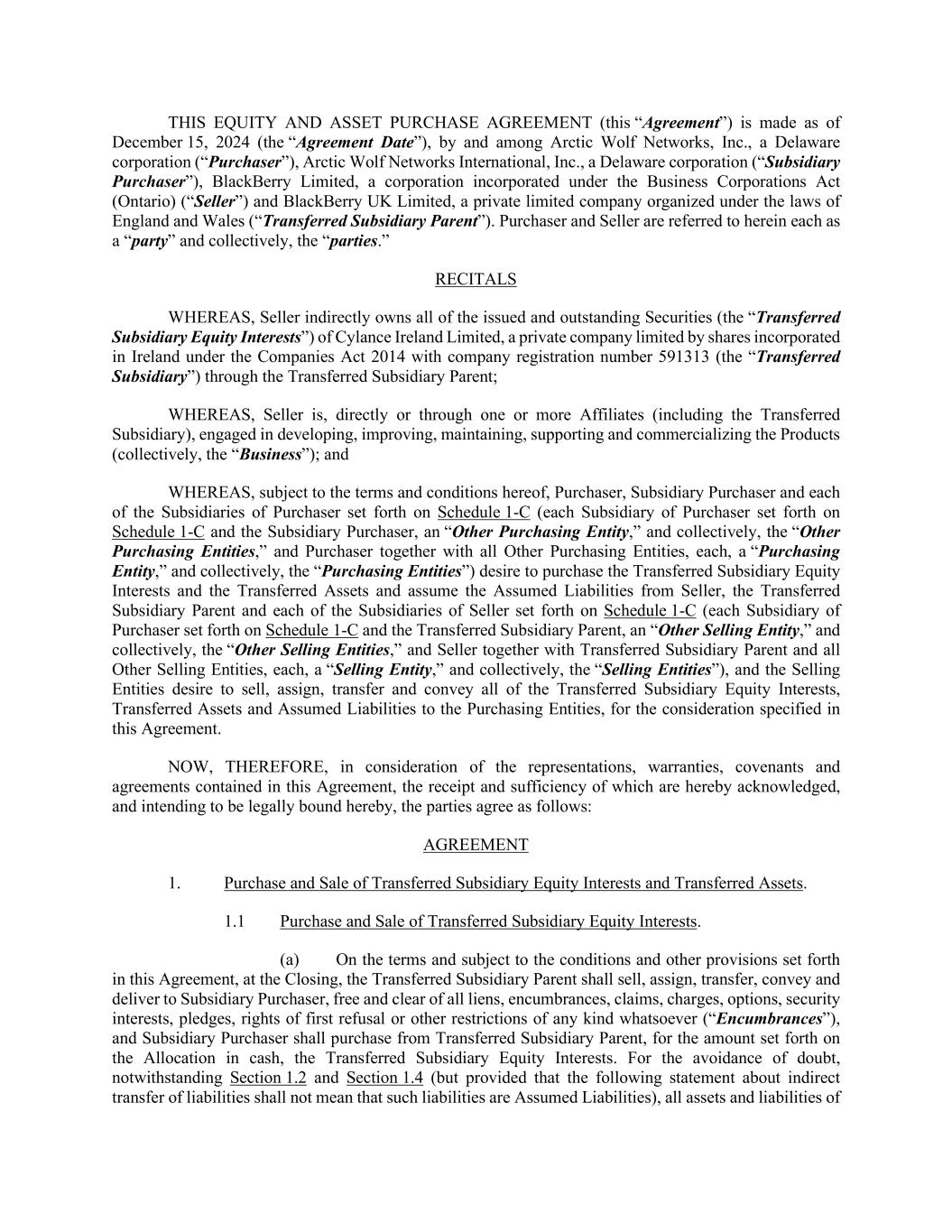 THIS EQUITY AND ASSET PURCHASE AGREEMENT (this “Agreement”) is made as of December 15, 2024 (the “Agreement Date”), by and among Arctic Wolf Networks, Inc., a Delaware corporation (“Purchaser”), Arctic Wolf Networks International, Inc., a Delaware corporation (“Subsidiary Purchaser”), BlackBerry Limited, a corporation incorporated under the Business Corporations Act (Ontario) (“Seller”) and BlackBerry UK Limited, a private limited company organized under the laws of England and Wales (“Transferred Subsidiary Parent”). Purchaser and Seller are referred to herein each as a “party” and collectively, the “parties.” RECITALS WHEREAS, Seller indirectly owns all of the issued and outstanding Securities (the “Transferred Subsidiary Equity Interests”) of Cylance Ireland Limited, a private company limited by shares incorporated in Ireland under the Companies Act 2014 with company registration number 591313 (the “Transferred Subsidiary”) through the Transferred Subsidiary Parent; WHEREAS, Seller is, directly or through one or more Affiliates (including the Transferred Subsidiary), engaged in developing, improving, maintaining, supporting and commercializing the Products (collectively, the “Business”); and WHEREAS, subject to the terms and conditions hereof, Purchaser, Subsidiary Purchaser and each of the Subsidiaries of Purchaser set forth on Schedule 1-C (each Subsidiary of Purchaser set forth on Schedule 1-C and the Subsidiary Purchaser, an “Other Purchasing Entity,” and collectively, the “Other Purchasing Entities,” and Purchaser together with all Other Purchasing Entities, each, a “Purchasing Entity,” and collectively, the “Purchasing Entities”) desire to purchase the Transferred Subsidiary Equity Interests and the Transferred Assets and assume the Assumed Liabilities from Seller, the Transferred Subsidiary Parent and each of the Subsidiaries of Seller set forth on Schedule 1-C (each Subsidiary of Purchaser set forth on Schedule 1-C and the Transferred Subsidiary Parent, an “Other Selling Entity,” and collectively, the “Other Selling Entities,” and Seller together with Transferred Subsidiary Parent and all Other Selling Entities, each, a “Selling Entity,” and collectively, the “Selling Entities”), and the Selling Entities desire to sell, assign, transfer and convey all of the Transferred Subsidiary Equity Interests, Transferred Assets and Assumed Liabilities to the Purchasing Entities, for the consideration specified in this Agreement. NOW, THEREFORE, in consideration of the representations, warranties, covenants and agreements contained in this Agreement, the receipt and sufficiency of which are hereby acknowledged, and intending to be legally bound hereby, the parties agree as follows: AGREEMENT 1. Purchase and Sale of Transferred Subsidiary Equity Interests and Transferred Assets. 1.1 Purchase and Sale of Transferred Subsidiary Equity Interests. (a) On the terms and subject to the conditions and other provisions set forth in this Agreement, at the Closing, the Transferred Subsidiary Parent shall sell, assign, transfer, convey and deliver to Subsidiary Purchaser, free and clear of all liens, encumbrances, claims, charges, options, security interests, pledges, rights of first refusal or other restrictions of any kind whatsoever (“Encumbrances”), and Subsidiary Purchaser shall purchase from Transferred Subsidiary Parent, for the amount set forth on the Allocation in cash, the Transferred Subsidiary Equity Interests. For the avoidance of doubt, notwithstanding Section 1.2 and Section 1.4 (but provided that the following statement about indirect transfer of liabilities shall not mean that such liabilities are Assumed Liabilities), all assets and liabilities of