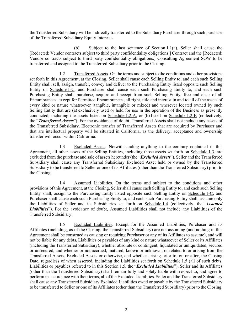 2 the Transferred Subsidiary will be indirectly transferred to the Subsidiary Purchaser through such purchase of the Transferred Subsidiary Equity Interests. (b) Subject to the last sentence of Section 1.1(a), Seller shall cause the [Redacted: Vendor contracts subject to third party confidentiality obligations.] Contract and the [Redacted: Vendor contracts subject to third party confidentiality obligations.] Consulting Agreement SOW to be transferred and assigned to the Transferred Subsidiary prior to the Closing. 1.2 Transferred Assets. On the terms and subject to the conditions and other provisions set forth in this Agreement, at the Closing, Seller shall cause each Selling Entity to, and each such Selling Entity shall, sell, assign, transfer, convey and deliver to the Purchasing Entity listed opposite such Selling Entity on Schedule 1-C, and Purchaser shall cause each such Purchasing Entity to, and each such Purchasing Entity shall, purchase, acquire and accept from such Selling Entity, free and clear of all Encumbrances, except for Permitted Encumbrances, all right, title and interest in and to all of the assets of every kind or nature whatsoever (tangible, intangible or mixed) and wherever located owned by such Selling Entity that are (a) exclusively used or held for use in the operation of the Business as presently conducted, including the assets listed on Schedule 1.2-A, or (b) listed on Schedule 1.2-B (collectively, the “Transferred Assets”). For the avoidance of doubt, Transferred Assets shall not include any assets of the Transferred Subsidiary. Electronic transfer of Transferred Assets that are acquired by Purchaser and that are intellectual property will be situated in California, as the delivery, acceptance and ownership transfer will occur within California. 1.3 Excluded Assets. Notwithstanding anything to the contrary contained in this Agreement, all other assets of the Selling Entities, including those assets set forth on Schedule 1.3, are excluded from the purchase and sale of assets hereunder (the “Excluded Assets”). Seller and the Transferred Subsidiary shall cause any Transferred Subsidiary Excluded Asset held or owned by the Transferred Subsidiary to be transferred to Seller or one of its Affiliates (other than the Transferred Subsidiary) prior to the Closing. 1.4 Assumed Liabilities. On the terms and subject to the conditions and other provisions of this Agreement, at the Closing, Seller shall cause each Selling Entity to, and each such Selling Entity shall, assign to the Purchasing Entity listed opposite such Selling Entity on Schedule 1-C, and Purchaser shall cause each such Purchasing Entity to, and each such Purchasing Entity shall, assume only the Liabilities of Seller and its Subsidiaries set forth on Schedule 1.4 (collectively, the “Assumed Liabilities”). For the avoidance of doubt, Assumed Liabilities shall not include any Liabilities of the Transferred Subsidiary. 1.5 Excluded Liabilities. Except for the Assumed Liabilities, Purchaser and its Affiliates (including, as of the Closing, the Transferred Subsidiary) are not assuming (and nothing in this Agreement shall be construed as causing or requiring Purchaser or any of its Affiliates to assume), and will not be liable for any debts, Liabilities or payables of any kind or nature whatsoever of Seller or its Affiliates (including the Transferred Subsidiary), whether absolute or contingent, liquidated or unliquidated, secured or unsecured, and whether or not accrued, matured, known or unknown, or related to or arising from the Transferred Assets, Excluded Assets or otherwise, and whether arising prior to, on or after, the Closing Date, regardless of when asserted, including the Liabilities set forth on Schedule 1.5 (all of such debts, Liabilities or payables referred to in this Section 1.5, the “Excluded Liabilities”), Seller and its Affiliates (other than the Transferred Subsidiary) shall remain fully and solely liable with respect to, and agree to perform in accordance with their terms, all of the Excluded Liabilities. Seller and the Transferred Subsidiary shall cause any Transferred Subsidiary Excluded Liabilities owed or payable by the Transferred Subsidiary to be transferred to Seller or one of its Affiliates (other than the Transferred Subsidiary) prior to the Closing.