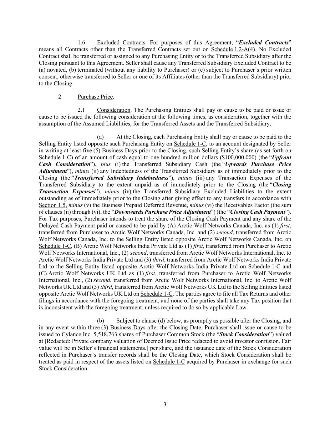 3 1.6 Excluded Contracts. For purposes of this Agreement, “Excluded Contracts” means all Contracts other than the Transferred Contracts set out on Schedule 1.2-A(4). No Excluded Contract shall be transferred or assigned to any Purchasing Entity or to the Transferred Subsidiary after the Closing pursuant to this Agreement. Seller shall cause any Transferred Subsidiary Excluded Contract to be (a) novated, (b) terminated (without any liability to Purchaser) or (c) subject to Purchaser’s prior written consent, otherwise transferred to Seller or one of its Affiliates (other than the Transferred Subsidiary) prior to the Closing. 2. Purchase Price. 2.1 Consideration. The Purchasing Entities shall pay or cause to be paid or issue or cause to be issued the following consideration at the following times, as consideration, together with the assumption of the Assumed Liabilities, for the Transferred Assets and the Transferred Subsidiary. (a) At the Closing, each Purchasing Entity shall pay or cause to be paid to the Selling Entity listed opposite such Purchasing Entity on Schedule 1-C, to an account designated by Seller in writing at least five (5) Business Days prior to the Closing, such Selling Entity’s share (as set forth on Schedule 1-C) of an amount of cash equal to one hundred million dollars ($100,000,000) (the “Upfront Cash Consideration”), plus (i) the Transferred Subsidiary Cash (the “Upwards Purchase Price Adjustment”), minus (ii) any Indebtedness of the Transferred Subsidiary as of immediately prior to the Closing (the “Transferred Subsidiary Indebtedness”), minus (iii) any Transaction Expenses of the Transferred Subsidiary to the extent unpaid as of immediately prior to the Closing (the “Closing Transaction Expenses”), minus (iv) the Transferred Subsidiary Excluded Liabilities to the extent outstanding as of immediately prior to the Closing after giving effect to any transfers in accordance with Section 1.5, minus (v) the Business Prepaid Deferred Revenue, minus (vi) the Receivables Factor (the sum of clauses (ii) through (vi), the “Downwards Purchase Price Adjustment”) (the “Closing Cash Payment”). For Tax purposes, Purchaser intends to treat the share of the Closing Cash Payment and any share of the Delayed Cash Payment paid or caused to be paid by (A) Arctic Wolf Networks Canada, Inc. as (1) first, transferred from Purchaser to Arctic Wolf Networks Canada, Inc. and (2) second, transferred from Arctic Wolf Networks Canada, Inc. to the Selling Entity listed opposite Arctic Wolf Networks Canada, Inc. on Schedule 1-C, (B) Arctic Wolf Networks India Private Ltd as (1) first, transferred from Purchaser to Arctic Wolf Networks International, Inc., (2) second, transferred from Arctic Wolf Networks International, Inc. to Arctic Wolf Networks India Private Ltd and (3) third, transferred from Arctic Wolf Networks India Private Ltd to the Selling Entity listed opposite Arctic Wolf Networks India Private Ltd on Schedule 1-C and (C) Arctic Wolf Networks UK Ltd as (1) first, transferred from Purchaser to Arctic Wolf Networks International, Inc., (2) second, transferred from Arctic Wolf Networks International, Inc. to Arctic Wolf Networks UK Ltd and (3) third, transferred from Arctic Wolf Networks UK Ltd to the Selling Entities listed opposite Arctic Wolf Networks UK Ltd on Schedule 1-C. The parties agree to file all Tax Returns and other filings in accordance with the foregoing treatment, and none of the parties shall take any Tax position that is inconsistent with the foregoing treatment, unless required to do so by applicable Law. (b) Subject to clause (d) below, as promptly as possible after the Closing, and in any event within three (3) Business Days after the Closing Date, Purchaser shall issue or cause to be issued to Cylance Inc. 5,518,763 shares of Purchaser Common Stock (the “Stock Consideration”) valued at [Redacted: Private company valuation of Deemed Issue Price redacted to avoid investor confusion. Fair value will be in Seller’s financial statements.] per share, and the issuance date of the Stock Consideration reflected in Purchaser’s transfer records shall be the Closing Date, which Stock Consideration shall be treated as paid in respect of the assets listed on Schedule 1-C acquired by Purchaser in exchange for such Stock Consideration.