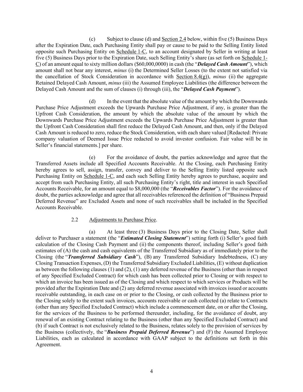 4 (c) Subject to clause (d) and Section 2.4 below, within five (5) Business Days after the Expiration Date, each Purchasing Entity shall pay or cause to be paid to the Selling Entity listed opposite such Purchasing Entity on Schedule 1-C, to an account designated by Seller in writing at least five (5) Business Days prior to the Expiration Date, such Selling Entity’s share (as set forth on Schedule 1- C) of an amount equal to sixty million dollars ($60,000,0000) in cash (the “Delayed Cash Amount”), which amount shall not bear any interest, minus (i) the Determined Seller Losses (to the extent not satisfied via the cancellation of Stock Consideration in accordance with Section 8.4(g)), minus (ii) the aggregate Retained Delayed Cash Amount, minus (iii) the Assumed Employee Liabilities (the difference between the Delayed Cash Amount and the sum of clauses (i) through (iii), the “Delayed Cash Payment”). (d) In the event that the absolute value of the amount by which the Downwards Purchase Price Adjustment exceeds the Upwards Purchase Price Adjustment, if any, is greater than the Upfront Cash Consideration, the amount by which the absolute value of the amount by which the Downwards Purchase Price Adjustment exceeds the Upwards Purchase Price Adjustment is greater than the Upfront Cash Consideration shall first reduce the Delayed Cash Amount, and then, only if the Delayed Cash Amount is reduced to zero, reduce the Stock Consideration, with each share valued [Redacted: Private company valuation of Deemed Issue Price redacted to avoid investor confusion. Fair value will be in Seller’s financial statements.] per share. (e) For the avoidance of doubt, the parties acknowledge and agree that the Transferred Assets include all Specified Accounts Receivable. At the Closing, each Purchasing Entity hereby agrees to sell, assign, transfer, convey and deliver to the Selling Entity listed opposite such Purchasing Entity on Schedule 1-C, and each such Selling Entity hereby agrees to purchase, acquire and accept from such Purchasing Entity, all such Purchasing Entity’s right, title and interest in such Specified Accounts Receivable, for an amount equal to $8,000,000 (the “Receivables Factor”). For the avoidance of doubt, the parties acknowledge and agree that all receivables referenced the definition of “Business Prepaid Deferred Revenue” are Excluded Assets and none of such receivables shall be included in the Specified Accounts Receivable. 2.2 Adjustments to Purchase Price. (a) At least three (3) Business Days prior to the Closing Date, Seller shall deliver to Purchaser a statement (the “Estimated Closing Statement”) setting forth (i) Seller’s good faith calculation of the Closing Cash Payment and (ii) the components thereof, including Seller’s good faith estimates of (A) the cash and cash equivalents of the Transferred Subsidiary as of immediately prior to the Closing (the “Transferred Subsidiary Cash”), (B) any Transferred Subsidiary Indebtedness, (C) any Closing Transaction Expenses, (D) the Transferred Subsidiary Excluded Liabilities, (E) without duplication as between the following clauses (1) and (2), (1) any deferred revenue of the Business (other than in respect of any Specified Excluded Contract) for which cash has been collected prior to Closing or with respect to which an invoice has been issued as of the Closing and which respect to which services or Products will be provided after the Expiration Date and (2) any deferred revenue associated with invoices issued or accounts receivable outstanding, in each case on or prior to the Closing, or cash collected by the Business prior to the Closing solely to the extent such invoices, accounts receivable or cash collected (a) relate to Contracts (other than any Specified Excluded Contract) which include a commencement date, on or after the Closing, for the services of the Business to be performed thereunder, including, for the avoidance of doubt, any renewal of an existing Contract relating to the Business (other than any Specified Excluded Contract) and (b) if such Contract is not exclusively related to the Business, relates solely to the provision of services by the Business (collectively, the “Business Prepaid Deferred Revenue”) and (F) the Assumed Employee Liabilities, each as calculated in accordance with GAAP subject to the definitions set forth in this Agreement.