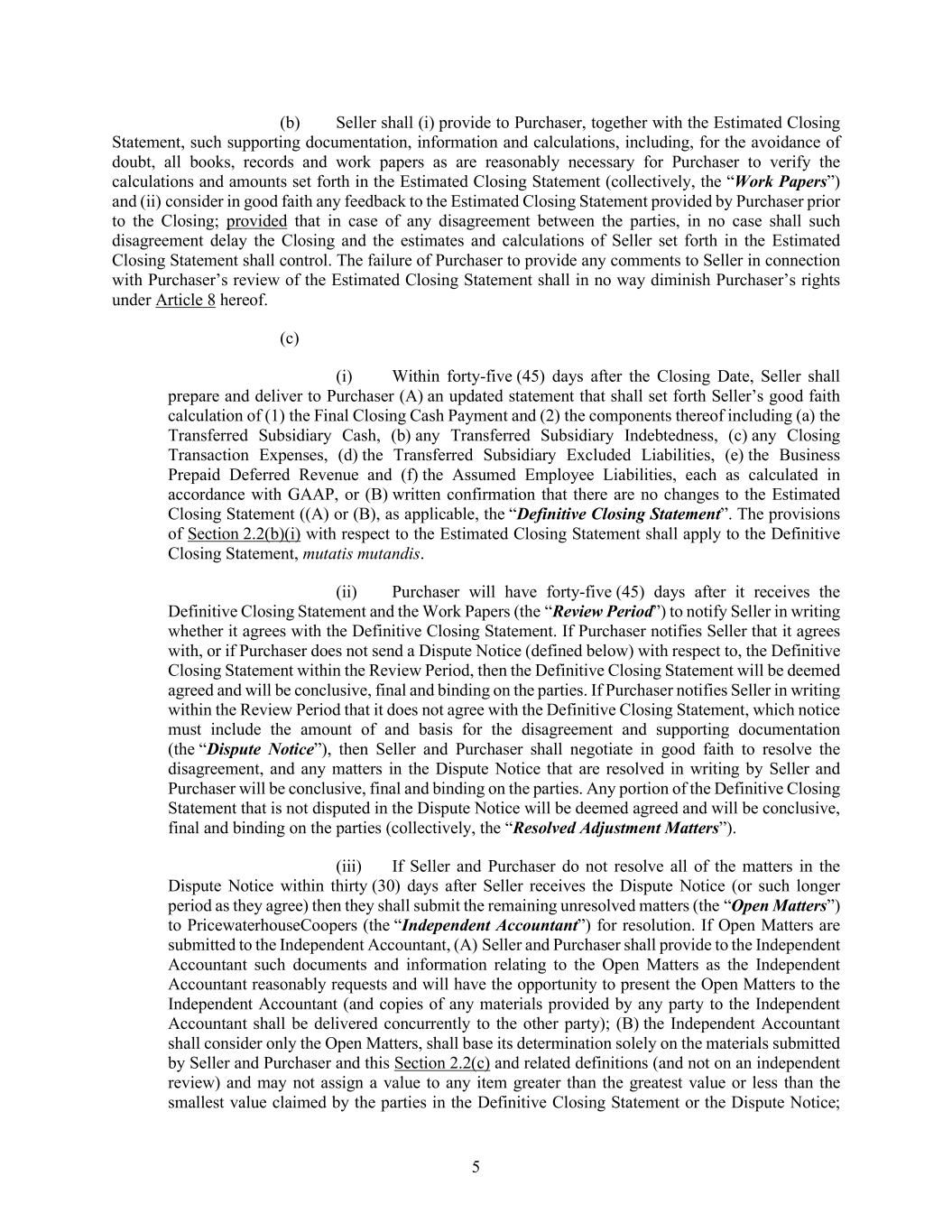 5 (b) Seller shall (i) provide to Purchaser, together with the Estimated Closing Statement, such supporting documentation, information and calculations, including, for the avoidance of doubt, all books, records and work papers as are reasonably necessary for Purchaser to verify the calculations and amounts set forth in the Estimated Closing Statement (collectively, the “Work Papers”) and (ii) consider in good faith any feedback to the Estimated Closing Statement provided by Purchaser prior to the Closing; provided that in case of any disagreement between the parties, in no case shall such disagreement delay the Closing and the estimates and calculations of Seller set forth in the Estimated Closing Statement shall control. The failure of Purchaser to provide any comments to Seller in connection with Purchaser’s review of the Estimated Closing Statement shall in no way diminish Purchaser’s rights under Article 8 hereof. (c) (i) Within forty-five (45) days after the Closing Date, Seller shall prepare and deliver to Purchaser (A) an updated statement that shall set forth Seller’s good faith calculation of (1) the Final Closing Cash Payment and (2) the components thereof including (a) the Transferred Subsidiary Cash, (b) any Transferred Subsidiary Indebtedness, (c) any Closing Transaction Expenses, (d) the Transferred Subsidiary Excluded Liabilities, (e) the Business Prepaid Deferred Revenue and (f) the Assumed Employee Liabilities, each as calculated in accordance with GAAP, or (B) written confirmation that there are no changes to the Estimated Closing Statement ((A) or (B), as applicable, the “Definitive Closing Statement”. The provisions of Section 2.2(b)(i) with respect to the Estimated Closing Statement shall apply to the Definitive Closing Statement, mutatis mutandis. (ii) Purchaser will have forty-five (45) days after it receives the Definitive Closing Statement and the Work Papers (the “Review Period”) to notify Seller in writing whether it agrees with the Definitive Closing Statement. If Purchaser notifies Seller that it agrees with, or if Purchaser does not send a Dispute Notice (defined below) with respect to, the Definitive Closing Statement within the Review Period, then the Definitive Closing Statement will be deemed agreed and will be conclusive, final and binding on the parties. If Purchaser notifies Seller in writing within the Review Period that it does not agree with the Definitive Closing Statement, which notice must include the amount of and basis for the disagreement and supporting documentation (the “Dispute Notice”), then Seller and Purchaser shall negotiate in good faith to resolve the disagreement, and any matters in the Dispute Notice that are resolved in writing by Seller and Purchaser will be conclusive, final and binding on the parties. Any portion of the Definitive Closing Statement that is not disputed in the Dispute Notice will be deemed agreed and will be conclusive, final and binding on the parties (collectively, the “Resolved Adjustment Matters”). (iii) If Seller and Purchaser do not resolve all of the matters in the Dispute Notice within thirty (30) days after Seller receives the Dispute Notice (or such longer period as they agree) then they shall submit the remaining unresolved matters (the “Open Matters”) to PricewaterhouseCoopers (the “Independent Accountant”) for resolution. If Open Matters are submitted to the Independent Accountant, (A) Seller and Purchaser shall provide to the Independent Accountant such documents and information relating to the Open Matters as the Independent Accountant reasonably requests and will have the opportunity to present the Open Matters to the Independent Accountant (and copies of any materials provided by any party to the Independent Accountant shall be delivered concurrently to the other party); (B) the Independent Accountant shall consider only the Open Matters, shall base its determination solely on the materials submitted by Seller and Purchaser and this Section 2.2(c) and related definitions (and not on an independent review) and may not assign a value to any item greater than the greatest value or less than the smallest value claimed by the parties in the Definitive Closing Statement or the Dispute Notice;