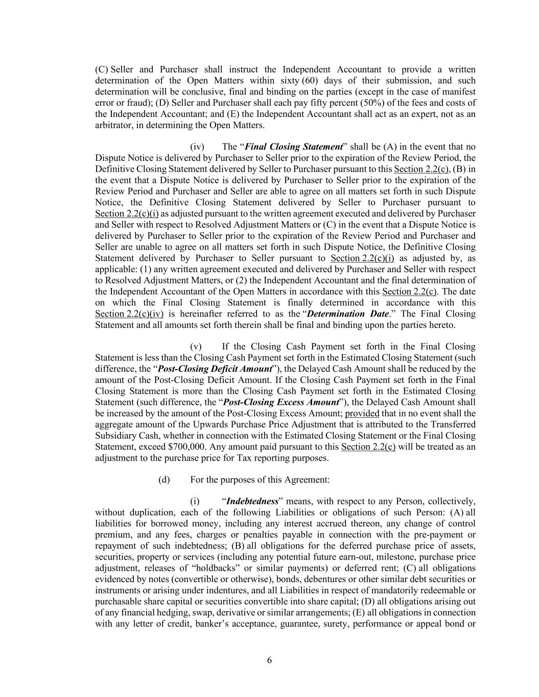 6 (C) Seller and Purchaser shall instruct the Independent Accountant to provide a written determination of the Open Matters within sixty (60) days of their submission, and such determination will be conclusive, final and binding on the parties (except in the case of manifest error or fraud); (D) Seller and Purchaser shall each pay fifty percent (50%) of the fees and costs of the Independent Accountant; and (E) the Independent Accountant shall act as an expert, not as an arbitrator, in determining the Open Matters. (iv) The “Final Closing Statement” shall be (A) in the event that no Dispute Notice is delivered by Purchaser to Seller prior to the expiration of the Review Period, the Definitive Closing Statement delivered by Seller to Purchaser pursuant to this Section 2.2(c), (B) in the event that a Dispute Notice is delivered by Purchaser to Seller prior to the expiration of the Review Period and Purchaser and Seller are able to agree on all matters set forth in such Dispute Notice, the Definitive Closing Statement delivered by Seller to Purchaser pursuant to Section 2.2(c)(i) as adjusted pursuant to the written agreement executed and delivered by Purchaser and Seller with respect to Resolved Adjustment Matters or (C) in the event that a Dispute Notice is delivered by Purchaser to Seller prior to the expiration of the Review Period and Purchaser and Seller are unable to agree on all matters set forth in such Dispute Notice, the Definitive Closing Statement delivered by Purchaser to Seller pursuant to Section 2.2(c)(i) as adjusted by, as applicable: (1) any written agreement executed and delivered by Purchaser and Seller with respect to Resolved Adjustment Matters, or (2) the Independent Accountant and the final determination of the Independent Accountant of the Open Matters in accordance with this Section 2.2(c). The date on which the Final Closing Statement is finally determined in accordance with this Section 2.2(c)(iv) is hereinafter referred to as the “Determination Date.” The Final Closing Statement and all amounts set forth therein shall be final and binding upon the parties hereto. (v) If the Closing Cash Payment set forth in the Final Closing Statement is less than the Closing Cash Payment set forth in the Estimated Closing Statement (such difference, the “Post-Closing Deficit Amount”), the Delayed Cash Amount shall be reduced by the amount of the Post-Closing Deficit Amount. If the Closing Cash Payment set forth in the Final Closing Statement is more than the Closing Cash Payment set forth in the Estimated Closing Statement (such difference, the “Post-Closing Excess Amount”), the Delayed Cash Amount shall be increased by the amount of the Post-Closing Excess Amount; provided that in no event shall the aggregate amount of the Upwards Purchase Price Adjustment that is attributed to the Transferred Subsidiary Cash, whether in connection with the Estimated Closing Statement or the Final Closing Statement, exceed $700,000. Any amount paid pursuant to this Section 2.2(c) will be treated as an adjustment to the purchase price for Tax reporting purposes. (d) For the purposes of this Agreement: (i) “Indebtedness” means, with respect to any Person, collectively, without duplication, each of the following Liabilities or obligations of such Person: (A) all liabilities for borrowed money, including any interest accrued thereon, any change of control premium, and any fees, charges or penalties payable in connection with the pre-payment or repayment of such indebtedness; (B) all obligations for the deferred purchase price of assets, securities, property or services (including any potential future earn-out, milestone, purchase price adjustment, releases of “holdbacks” or similar payments) or deferred rent; (C) all obligations evidenced by notes (convertible or otherwise), bonds, debentures or other similar debt securities or instruments or arising under indentures, and all Liabilities in respect of mandatorily redeemable or purchasable share capital or securities convertible into share capital; (D) all obligations arising out of any financial hedging, swap, derivative or similar arrangements; (E) all obligations in connection with any letter of credit, banker’s acceptance, guarantee, surety, performance or appeal bond or