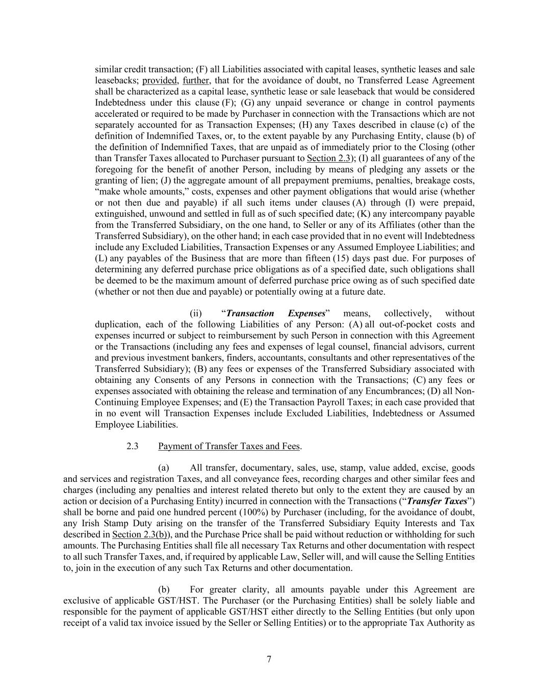 7 similar credit transaction; (F) all Liabilities associated with capital leases, synthetic leases and sale leasebacks; provided, further, that for the avoidance of doubt, no Transferred Lease Agreement shall be characterized as a capital lease, synthetic lease or sale leaseback that would be considered Indebtedness under this clause (F); (G) any unpaid severance or change in control payments accelerated or required to be made by Purchaser in connection with the Transactions which are not separately accounted for as Transaction Expenses; (H) any Taxes described in clause (c) of the definition of Indemnified Taxes, or, to the extent payable by any Purchasing Entity, clause (b) of the definition of Indemnified Taxes, that are unpaid as of immediately prior to the Closing (other than Transfer Taxes allocated to Purchaser pursuant to Section 2.3); (I) all guarantees of any of the foregoing for the benefit of another Person, including by means of pledging any assets or the granting of lien; (J) the aggregate amount of all prepayment premiums, penalties, breakage costs, “make whole amounts,” costs, expenses and other payment obligations that would arise (whether or not then due and payable) if all such items under clauses (A) through (I) were prepaid, extinguished, unwound and settled in full as of such specified date; (K) any intercompany payable from the Transferred Subsidiary, on the one hand, to Seller or any of its Affiliates (other than the Transferred Subsidiary), on the other hand; in each case provided that in no event will Indebtedness include any Excluded Liabilities, Transaction Expenses or any Assumed Employee Liabilities; and (L) any payables of the Business that are more than fifteen (15) days past due. For purposes of determining any deferred purchase price obligations as of a specified date, such obligations shall be deemed to be the maximum amount of deferred purchase price owing as of such specified date (whether or not then due and payable) or potentially owing at a future date. (ii) “Transaction Expenses” means, collectively, without duplication, each of the following Liabilities of any Person: (A) all out-of-pocket costs and expenses incurred or subject to reimbursement by such Person in connection with this Agreement or the Transactions (including any fees and expenses of legal counsel, financial advisors, current and previous investment bankers, finders, accountants, consultants and other representatives of the Transferred Subsidiary); (B) any fees or expenses of the Transferred Subsidiary associated with obtaining any Consents of any Persons in connection with the Transactions; (C) any fees or expenses associated with obtaining the release and termination of any Encumbrances; (D) all Non- Continuing Employee Expenses; and (E) the Transaction Payroll Taxes; in each case provided that in no event will Transaction Expenses include Excluded Liabilities, Indebtedness or Assumed Employee Liabilities. 2.3 Payment of Transfer Taxes and Fees. (a) All transfer, documentary, sales, use, stamp, value added, excise, goods and services and registration Taxes, and all conveyance fees, recording charges and other similar fees and charges (including any penalties and interest related thereto but only to the extent they are caused by an action or decision of a Purchasing Entity) incurred in connection with the Transactions (“Transfer Taxes”) shall be borne and paid one hundred percent (100%) by Purchaser (including, for the avoidance of doubt, any Irish Stamp Duty arising on the transfer of the Transferred Subsidiary Equity Interests and Tax described in Section 2.3(b)), and the Purchase Price shall be paid without reduction or withholding for such amounts. The Purchasing Entities shall file all necessary Tax Returns and other documentation with respect to all such Transfer Taxes, and, if required by applicable Law, Seller will, and will cause the Selling Entities to, join in the execution of any such Tax Returns and other documentation. (b) For greater clarity, all amounts payable under this Agreement are exclusive of applicable GST/HST. The Purchaser (or the Purchasing Entities) shall be solely liable and responsible for the payment of applicable GST/HST either directly to the Selling Entities (but only upon receipt of a valid tax invoice issued by the Seller or Selling Entities) or to the appropriate Tax Authority as