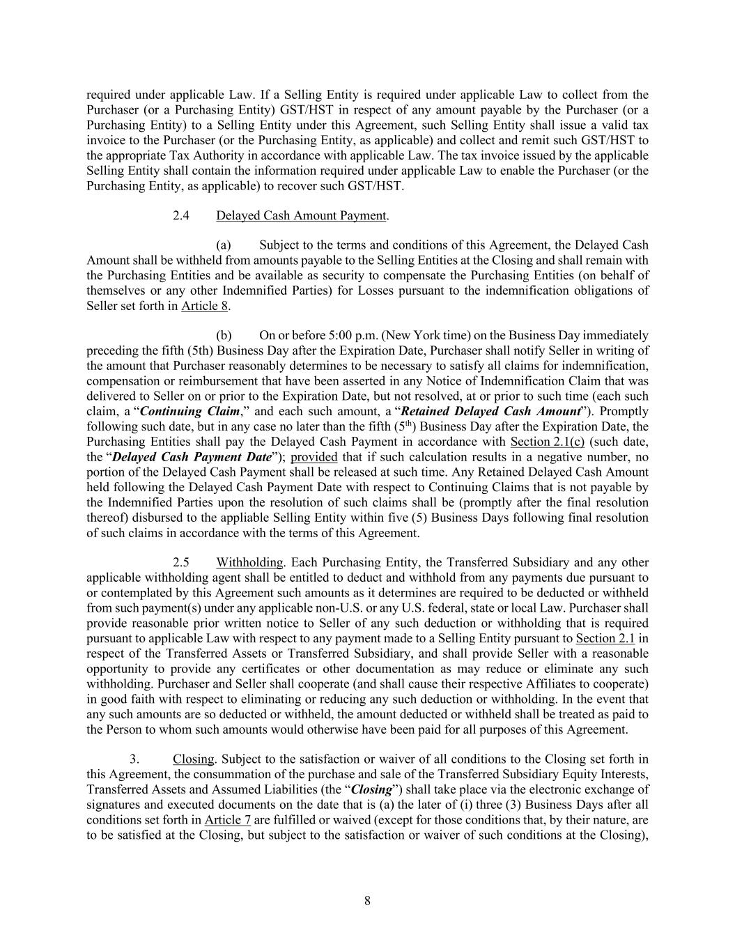 8 required under applicable Law. If a Selling Entity is required under applicable Law to collect from the Purchaser (or a Purchasing Entity) GST/HST in respect of any amount payable by the Purchaser (or a Purchasing Entity) to a Selling Entity under this Agreement, such Selling Entity shall issue a valid tax invoice to the Purchaser (or the Purchasing Entity, as applicable) and collect and remit such GST/HST to the appropriate Tax Authority in accordance with applicable Law. The tax invoice issued by the applicable Selling Entity shall contain the information required under applicable Law to enable the Purchaser (or the Purchasing Entity, as applicable) to recover such GST/HST. 2.4 Delayed Cash Amount Payment. (a) Subject to the terms and conditions of this Agreement, the Delayed Cash Amount shall be withheld from amounts payable to the Selling Entities at the Closing and shall remain with the Purchasing Entities and be available as security to compensate the Purchasing Entities (on behalf of themselves or any other Indemnified Parties) for Losses pursuant to the indemnification obligations of Seller set forth in Article 8. (b) On or before 5:00 p.m. (New York time) on the Business Day immediately preceding the fifth (5th) Business Day after the Expiration Date, Purchaser shall notify Seller in writing of the amount that Purchaser reasonably determines to be necessary to satisfy all claims for indemnification, compensation or reimbursement that have been asserted in any Notice of Indemnification Claim that was delivered to Seller on or prior to the Expiration Date, but not resolved, at or prior to such time (each such claim, a “Continuing Claim,” and each such amount, a “Retained Delayed Cash Amount”). Promptly following such date, but in any case no later than the fifth (5th) Business Day after the Expiration Date, the Purchasing Entities shall pay the Delayed Cash Payment in accordance with Section 2.1(c) (such date, the “Delayed Cash Payment Date”); provided that if such calculation results in a negative number, no portion of the Delayed Cash Payment shall be released at such time. Any Retained Delayed Cash Amount held following the Delayed Cash Payment Date with respect to Continuing Claims that is not payable by the Indemnified Parties upon the resolution of such claims shall be (promptly after the final resolution thereof) disbursed to the appliable Selling Entity within five (5) Business Days following final resolution of such claims in accordance with the terms of this Agreement. 2.5 Withholding. Each Purchasing Entity, the Transferred Subsidiary and any other applicable withholding agent shall be entitled to deduct and withhold from any payments due pursuant to or contemplated by this Agreement such amounts as it determines are required to be deducted or withheld from such payment(s) under any applicable non-U.S. or any U.S. federal, state or local Law. Purchaser shall provide reasonable prior written notice to Seller of any such deduction or withholding that is required pursuant to applicable Law with respect to any payment made to a Selling Entity pursuant to Section 2.1 in respect of the Transferred Assets or Transferred Subsidiary, and shall provide Seller with a reasonable opportunity to provide any certificates or other documentation as may reduce or eliminate any such withholding. Purchaser and Seller shall cooperate (and shall cause their respective Affiliates to cooperate) in good faith with respect to eliminating or reducing any such deduction or withholding. In the event that any such amounts are so deducted or withheld, the amount deducted or withheld shall be treated as paid to the Person to whom such amounts would otherwise have been paid for all purposes of this Agreement. 3. Closing. Subject to the satisfaction or waiver of all conditions to the Closing set forth in this Agreement, the consummation of the purchase and sale of the Transferred Subsidiary Equity Interests, Transferred Assets and Assumed Liabilities (the “Closing”) shall take place via the electronic exchange of signatures and executed documents on the date that is (a) the later of (i) three (3) Business Days after all conditions set forth in Article 7 are fulfilled or waived (except for those conditions that, by their nature, are to be satisfied at the Closing, but subject to the satisfaction or waiver of such conditions at the Closing),