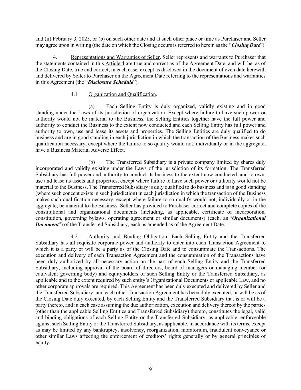 9 and (ii) February 3, 2025, or (b) on such other date and at such other place or time as Purchaser and Seller may agree upon in writing (the date on which the Closing occurs is referred to herein as the “Closing Date”). 4. Representations and Warranties of Seller. Seller represents and warrants to Purchaser that the statements contained in this Article 4 are true and correct as of the Agreement Date, and will be, as of the Closing Date, true and correct, in each case, except as disclosed in the document of even date herewith and delivered by Seller to Purchaser on the Agreement Date referring to the representations and warranties in this Agreement (the “Disclosure Schedule”). 4.1 Organization and Qualification. (a) Each Selling Entity is duly organized, validly existing and in good standing under the Laws of its jurisdiction of organization. Except where failure to have such power or authority would not be material to the Business, the Selling Entities together have the full power and authority to conduct the Business to the extent now conducted and each Selling Entity has full power and authority to own, use and lease its assets and properties. The Selling Entities are duly qualified to do business and are in good standing in each jurisdiction in which the transaction of the Business makes such qualification necessary, except where the failure to so qualify would not, individually or in the aggregate, have a Business Material Adverse Effect. (b) The Transferred Subsidiary is a private company limited by shares duly incorporated and validly existing under the Laws of the jurisdiction of its formation. The Transferred Subsidiary has full power and authority to conduct its business to the extent now conducted, and to own, use and lease its assets and properties, except where failure to have such power or authority would not be material to the Business. The Transferred Subsidiary is duly qualified to do business and is in good standing (where such concept exists in such jurisdiction) in each jurisdiction in which the transaction of the Business makes such qualification necessary, except where failure to so qualify would not, individually or in the aggregate, be material to the Business. Seller has provided to Purchaser correct and complete copies of the constitutional and organizational documents (including, as applicable, certificate of incorporation, constitution, governing bylaws, operating agreement or similar documents) (each, an “Organizational Document”) of the Transferred Subsidiary, each as amended as of the Agreement Date. 4.2 Authority and Binding Obligation. Each Selling Entity and the Transferred Subsidiary has all requisite corporate power and authority to enter into each Transaction Agreement to which it is a party or will be a party as of the Closing Date and to consummate the Transactions. The execution and delivery of each Transaction Agreement and the consummation of the Transactions have been duly authorized by all necessary action on the part of each Selling Entity and the Transferred Subsidiary, including approval of the board of directors, board of managers or managing member (or equivalent governing body) and equityholders of such Selling Entity or the Transferred Subsidiary, as applicable and to the extent required by such entity’s Organizational Documents or applicable Law, and no other corporate approvals are required. This Agreement has been duly executed and delivered by Seller and the Transferred Subsidiary, and each other Transaction Agreement has been duly executed, or will be as of the Closing Date duly executed, by each Selling Entity and the Transferred Subsidiary that is or will be a party thereto, and in each case assuming the due authorization, execution and delivery thereof by the parties (other than the applicable Selling Entities and Transferred Subsidiary) thereto, constitutes the legal, valid and binding obligations of each Selling Entity or the Transferred Subsidiary, as applicable, enforceable against such Selling Entity or the Transferred Subsidiary, as applicable, in accordance with its terms, except as may be limited by any bankruptcy, insolvency, reorganization, moratorium, fraudulent conveyance or other similar Laws affecting the enforcement of creditors’ rights generally or by general principles of equity.