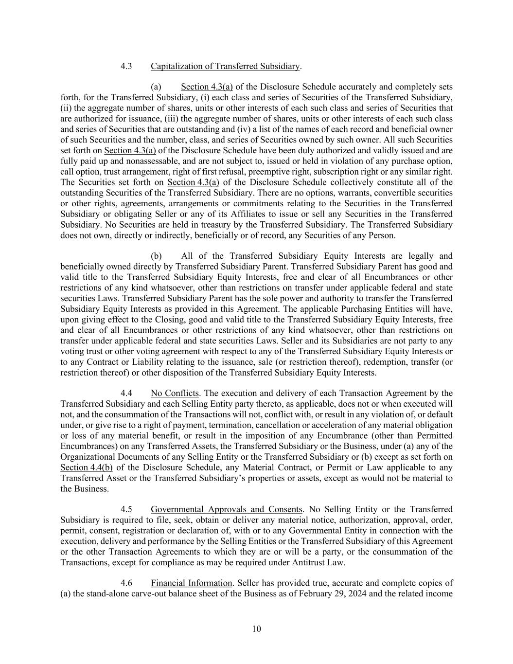 10 4.3 Capitalization of Transferred Subsidiary. (a) Section 4.3(a) of the Disclosure Schedule accurately and completely sets forth, for the Transferred Subsidiary, (i) each class and series of Securities of the Transferred Subsidiary, (ii) the aggregate number of shares, units or other interests of each such class and series of Securities that are authorized for issuance, (iii) the aggregate number of shares, units or other interests of each such class and series of Securities that are outstanding and (iv) a list of the names of each record and beneficial owner of such Securities and the number, class, and series of Securities owned by such owner. All such Securities set forth on Section 4.3(a) of the Disclosure Schedule have been duly authorized and validly issued and are fully paid up and nonassessable, and are not subject to, issued or held in violation of any purchase option, call option, trust arrangement, right of first refusal, preemptive right, subscription right or any similar right. The Securities set forth on Section 4.3(a) of the Disclosure Schedule collectively constitute all of the outstanding Securities of the Transferred Subsidiary. There are no options, warrants, convertible securities or other rights, agreements, arrangements or commitments relating to the Securities in the Transferred Subsidiary or obligating Seller or any of its Affiliates to issue or sell any Securities in the Transferred Subsidiary. No Securities are held in treasury by the Transferred Subsidiary. The Transferred Subsidiary does not own, directly or indirectly, beneficially or of record, any Securities of any Person. (b) All of the Transferred Subsidiary Equity Interests are legally and beneficially owned directly by Transferred Subsidiary Parent. Transferred Subsidiary Parent has good and valid title to the Transferred Subsidiary Equity Interests, free and clear of all Encumbrances or other restrictions of any kind whatsoever, other than restrictions on transfer under applicable federal and state securities Laws. Transferred Subsidiary Parent has the sole power and authority to transfer the Transferred Subsidiary Equity Interests as provided in this Agreement. The applicable Purchasing Entities will have, upon giving effect to the Closing, good and valid title to the Transferred Subsidiary Equity Interests, free and clear of all Encumbrances or other restrictions of any kind whatsoever, other than restrictions on transfer under applicable federal and state securities Laws. Seller and its Subsidiaries are not party to any voting trust or other voting agreement with respect to any of the Transferred Subsidiary Equity Interests or to any Contract or Liability relating to the issuance, sale (or restriction thereof), redemption, transfer (or restriction thereof) or other disposition of the Transferred Subsidiary Equity Interests. 4.4 No Conflicts. The execution and delivery of each Transaction Agreement by the Transferred Subsidiary and each Selling Entity party thereto, as applicable, does not or when executed will not, and the consummation of the Transactions will not, conflict with, or result in any violation of, or default under, or give rise to a right of payment, termination, cancellation or acceleration of any material obligation or loss of any material benefit, or result in the imposition of any Encumbrance (other than Permitted Encumbrances) on any Transferred Assets, the Transferred Subsidiary or the Business, under (a) any of the Organizational Documents of any Selling Entity or the Transferred Subsidiary or (b) except as set forth on Section 4.4(b) of the Disclosure Schedule, any Material Contract, or Permit or Law applicable to any Transferred Asset or the Transferred Subsidiary’s properties or assets, except as would not be material to the Business. 4.5 Governmental Approvals and Consents. No Selling Entity or the Transferred Subsidiary is required to file, seek, obtain or deliver any material notice, authorization, approval, order, permit, consent, registration or declaration of, with or to any Governmental Entity in connection with the execution, delivery and performance by the Selling Entities or the Transferred Subsidiary of this Agreement or the other Transaction Agreements to which they are or will be a party, or the consummation of the Transactions, except for compliance as may be required under Antitrust Law. 4.6 Financial Information. Seller has provided true, accurate and complete copies of (a) the stand-alone carve-out balance sheet of the Business as of February 29, 2024 and the related income
