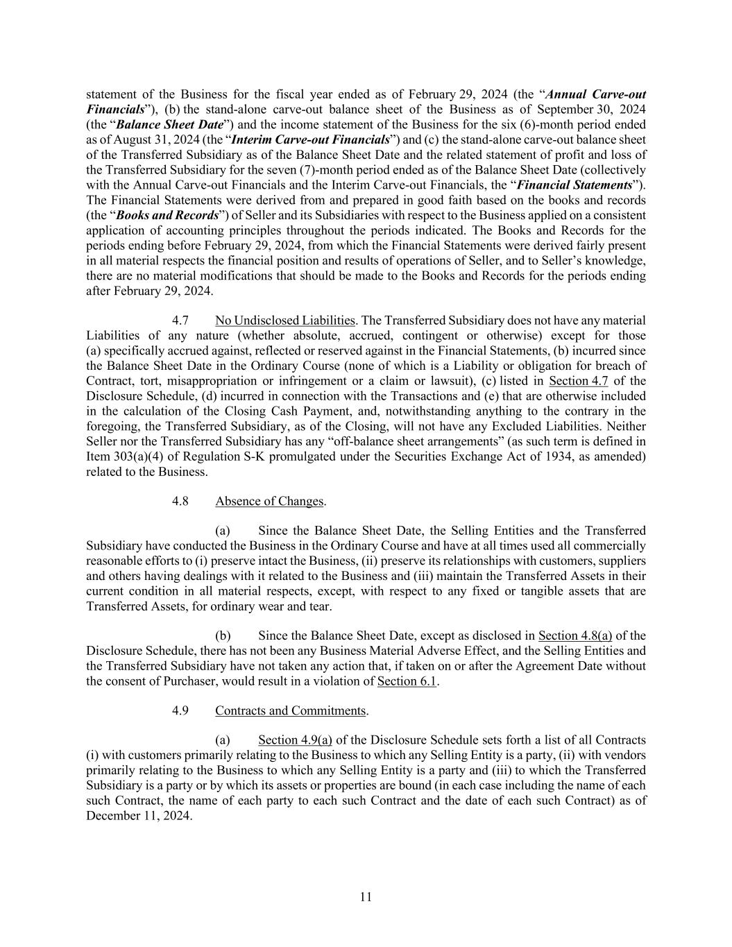 11 statement of the Business for the fiscal year ended as of February 29, 2024 (the “Annual Carve-out Financials”), (b) the stand-alone carve-out balance sheet of the Business as of September 30, 2024 (the “Balance Sheet Date”) and the income statement of the Business for the six (6)-month period ended as of August 31, 2024 (the “Interim Carve-out Financials”) and (c) the stand-alone carve-out balance sheet of the Transferred Subsidiary as of the Balance Sheet Date and the related statement of profit and loss of the Transferred Subsidiary for the seven (7)-month period ended as of the Balance Sheet Date (collectively with the Annual Carve-out Financials and the Interim Carve-out Financials, the “Financial Statements”). The Financial Statements were derived from and prepared in good faith based on the books and records (the “Books and Records”) of Seller and its Subsidiaries with respect to the Business applied on a consistent application of accounting principles throughout the periods indicated. The Books and Records for the periods ending before February 29, 2024, from which the Financial Statements were derived fairly present in all material respects the financial position and results of operations of Seller, and to Seller’s knowledge, there are no material modifications that should be made to the Books and Records for the periods ending after February 29, 2024. 4.7 No Undisclosed Liabilities. The Transferred Subsidiary does not have any material Liabilities of any nature (whether absolute, accrued, contingent or otherwise) except for those (a) specifically accrued against, reflected or reserved against in the Financial Statements, (b) incurred since the Balance Sheet Date in the Ordinary Course (none of which is a Liability or obligation for breach of Contract, tort, misappropriation or infringement or a claim or lawsuit), (c) listed in Section 4.7 of the Disclosure Schedule, (d) incurred in connection with the Transactions and (e) that are otherwise included in the calculation of the Closing Cash Payment, and, notwithstanding anything to the contrary in the foregoing, the Transferred Subsidiary, as of the Closing, will not have any Excluded Liabilities. Neither Seller nor the Transferred Subsidiary has any “off-balance sheet arrangements” (as such term is defined in Item 303(a)(4) of Regulation S-K promulgated under the Securities Exchange Act of 1934, as amended) related to the Business. 4.8 Absence of Changes. (a) Since the Balance Sheet Date, the Selling Entities and the Transferred Subsidiary have conducted the Business in the Ordinary Course and have at all times used all commercially reasonable efforts to (i) preserve intact the Business, (ii) preserve its relationships with customers, suppliers and others having dealings with it related to the Business and (iii) maintain the Transferred Assets in their current condition in all material respects, except, with respect to any fixed or tangible assets that are Transferred Assets, for ordinary wear and tear. (b) Since the Balance Sheet Date, except as disclosed in Section 4.8(a) of the Disclosure Schedule, there has not been any Business Material Adverse Effect, and the Selling Entities and the Transferred Subsidiary have not taken any action that, if taken on or after the Agreement Date without the consent of Purchaser, would result in a violation of Section 6.1. 4.9 Contracts and Commitments. (a) Section 4.9(a) of the Disclosure Schedule sets forth a list of all Contracts (i) with customers primarily relating to the Business to which any Selling Entity is a party, (ii) with vendors primarily relating to the Business to which any Selling Entity is a party and (iii) to which the Transferred Subsidiary is a party or by which its assets or properties are bound (in each case including the name of each such Contract, the name of each party to each such Contract and the date of each such Contract) as of December 11, 2024.