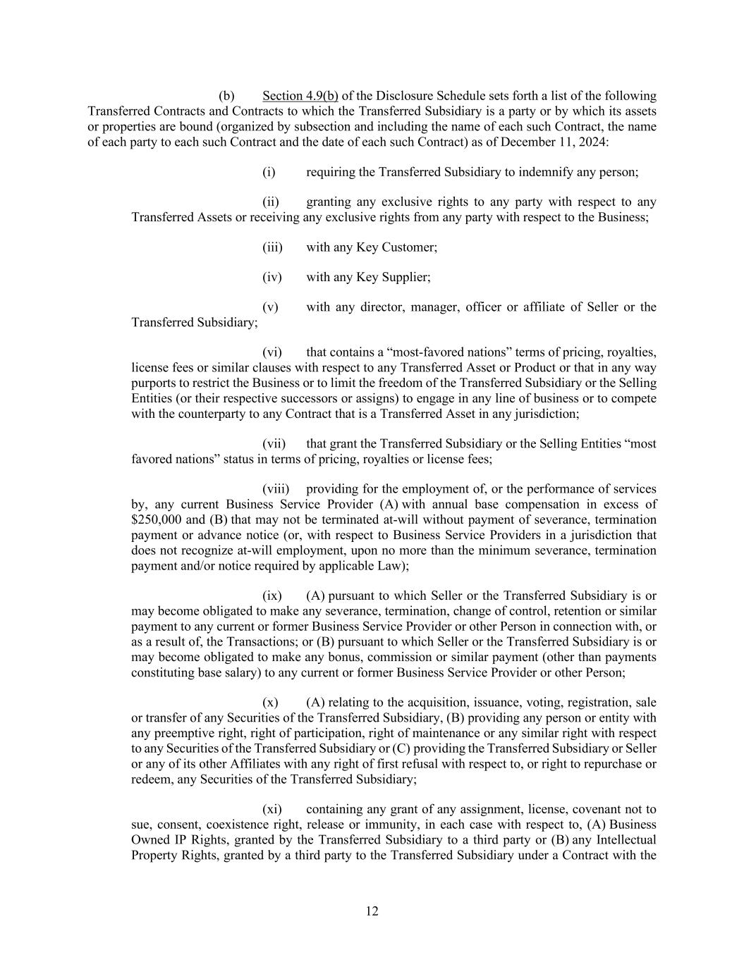 12 (b) Section 4.9(b) of the Disclosure Schedule sets forth a list of the following Transferred Contracts and Contracts to which the Transferred Subsidiary is a party or by which its assets or properties are bound (organized by subsection and including the name of each such Contract, the name of each party to each such Contract and the date of each such Contract) as of December 11, 2024: (i) requiring the Transferred Subsidiary to indemnify any person; (ii) granting any exclusive rights to any party with respect to any Transferred Assets or receiving any exclusive rights from any party with respect to the Business; (iii) with any Key Customer; (iv) with any Key Supplier; (v) with any director, manager, officer or affiliate of Seller or the Transferred Subsidiary; (vi) that contains a “most-favored nations” terms of pricing, royalties, license fees or similar clauses with respect to any Transferred Asset or Product or that in any way purports to restrict the Business or to limit the freedom of the Transferred Subsidiary or the Selling Entities (or their respective successors or assigns) to engage in any line of business or to compete with the counterparty to any Contract that is a Transferred Asset in any jurisdiction; (vii) that grant the Transferred Subsidiary or the Selling Entities “most favored nations” status in terms of pricing, royalties or license fees; (viii) providing for the employment of, or the performance of services by, any current Business Service Provider (A) with annual base compensation in excess of $250,000 and (B) that may not be terminated at-will without payment of severance, termination payment or advance notice (or, with respect to Business Service Providers in a jurisdiction that does not recognize at-will employment, upon no more than the minimum severance, termination payment and/or notice required by applicable Law); (ix) (A) pursuant to which Seller or the Transferred Subsidiary is or may become obligated to make any severance, termination, change of control, retention or similar payment to any current or former Business Service Provider or other Person in connection with, or as a result of, the Transactions; or (B) pursuant to which Seller or the Transferred Subsidiary is or may become obligated to make any bonus, commission or similar payment (other than payments constituting base salary) to any current or former Business Service Provider or other Person; (x) (A) relating to the acquisition, issuance, voting, registration, sale or transfer of any Securities of the Transferred Subsidiary, (B) providing any person or entity with any preemptive right, right of participation, right of maintenance or any similar right with respect to any Securities of the Transferred Subsidiary or (C) providing the Transferred Subsidiary or Seller or any of its other Affiliates with any right of first refusal with respect to, or right to repurchase or redeem, any Securities of the Transferred Subsidiary; (xi) containing any grant of any assignment, license, covenant not to sue, consent, coexistence right, release or immunity, in each case with respect to, (A) Business Owned IP Rights, granted by the Transferred Subsidiary to a third party or (B) any Intellectual Property Rights, granted by a third party to the Transferred Subsidiary under a Contract with the