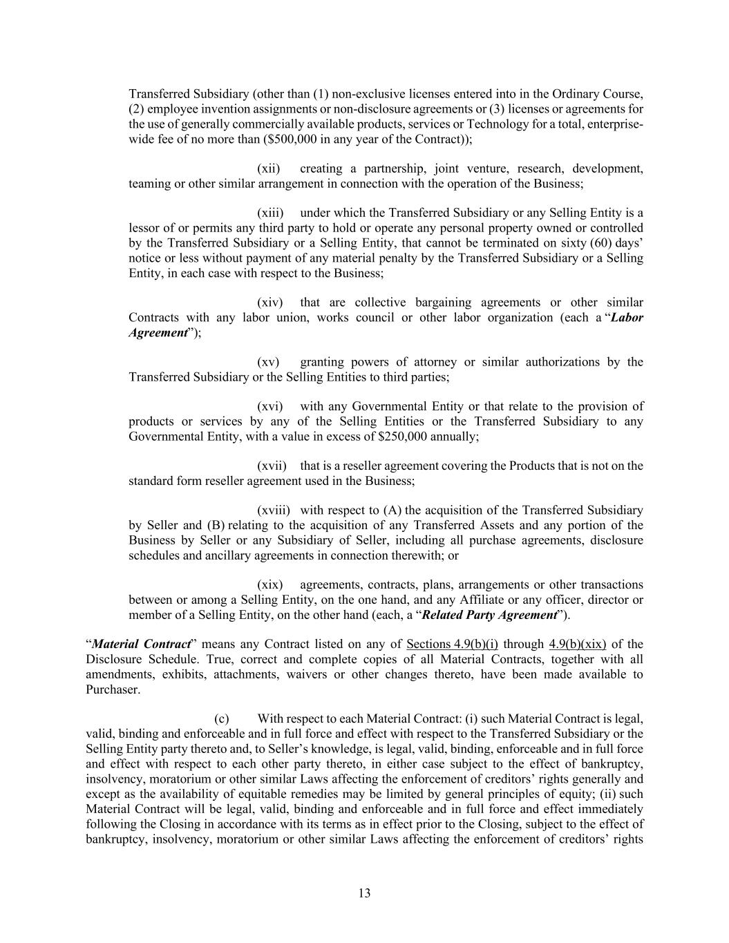 13 Transferred Subsidiary (other than (1) non-exclusive licenses entered into in the Ordinary Course, (2) employee invention assignments or non-disclosure agreements or (3) licenses or agreements for the use of generally commercially available products, services or Technology for a total, enterprise- wide fee of no more than ($500,000 in any year of the Contract)); (xii) creating a partnership, joint venture, research, development, teaming or other similar arrangement in connection with the operation of the Business; (xiii) under which the Transferred Subsidiary or any Selling Entity is a lessor of or permits any third party to hold or operate any personal property owned or controlled by the Transferred Subsidiary or a Selling Entity, that cannot be terminated on sixty (60) days’ notice or less without payment of any material penalty by the Transferred Subsidiary or a Selling Entity, in each case with respect to the Business; (xiv) that are collective bargaining agreements or other similar Contracts with any labor union, works council or other labor organization (each a “Labor Agreement”); (xv) granting powers of attorney or similar authorizations by the Transferred Subsidiary or the Selling Entities to third parties; (xvi) with any Governmental Entity or that relate to the provision of products or services by any of the Selling Entities or the Transferred Subsidiary to any Governmental Entity, with a value in excess of $250,000 annually; (xvii) that is a reseller agreement covering the Products that is not on the standard form reseller agreement used in the Business; (xviii) with respect to (A) the acquisition of the Transferred Subsidiary by Seller and (B) relating to the acquisition of any Transferred Assets and any portion of the Business by Seller or any Subsidiary of Seller, including all purchase agreements, disclosure schedules and ancillary agreements in connection therewith; or (xix) agreements, contracts, plans, arrangements or other transactions between or among a Selling Entity, on the one hand, and any Affiliate or any officer, director or member of a Selling Entity, on the other hand (each, a “Related Party Agreement”). “Material Contract” means any Contract listed on any of Sections 4.9(b)(i) through 4.9(b)(xix) of the Disclosure Schedule. True, correct and complete copies of all Material Contracts, together with all amendments, exhibits, attachments, waivers or other changes thereto, have been made available to Purchaser. (c) With respect to each Material Contract: (i) such Material Contract is legal, valid, binding and enforceable and in full force and effect with respect to the Transferred Subsidiary or the Selling Entity party thereto and, to Seller’s knowledge, is legal, valid, binding, enforceable and in full force and effect with respect to each other party thereto, in either case subject to the effect of bankruptcy, insolvency, moratorium or other similar Laws affecting the enforcement of creditors’ rights generally and except as the availability of equitable remedies may be limited by general principles of equity; (ii) such Material Contract will be legal, valid, binding and enforceable and in full force and effect immediately following the Closing in accordance with its terms as in effect prior to the Closing, subject to the effect of bankruptcy, insolvency, moratorium or other similar Laws affecting the enforcement of creditors’ rights