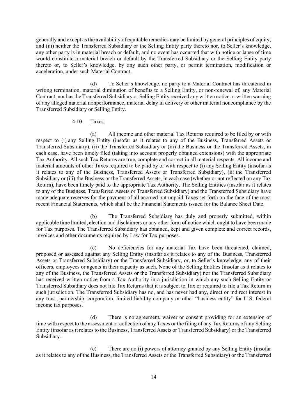 14 generally and except as the availability of equitable remedies may be limited by general principles of equity; and (iii) neither the Transferred Subsidiary or the Selling Entity party thereto nor, to Seller’s knowledge, any other party is in material breach or default, and no event has occurred that with notice or lapse of time would constitute a material breach or default by the Transferred Subsidiary or the Selling Entity party thereto or, to Seller’s knowledge, by any such other party, or permit termination, modification or acceleration, under such Material Contract. (d) To Seller’s knowledge, no party to a Material Contract has threatened in writing termination, material diminution of benefits to a Selling Entity, or non-renewal of, any Material Contract, nor has the Transferred Subsidiary or Selling Entity received any written notice or written warning of any alleged material nonperformance, material delay in delivery or other material noncompliance by the Transferred Subsidiary or Selling Entity. 4.10 Taxes. (a) All income and other material Tax Returns required to be filed by or with respect to (i) any Selling Entity (insofar as it relates to any of the Business, Transferred Assets or Transferred Subsidiary), (ii) the Transferred Subsidiary or (iii) the Business or the Transferred Assets, in each case, have been timely filed (taking into account properly obtained extensions) with the appropriate Tax Authority. All such Tax Returns are true, complete and correct in all material respects. All income and material amounts of other Taxes required to be paid by or with respect to (i) any Selling Entity (insofar as it relates to any of the Business, Transferred Assets or Transferred Subsidiary), (ii) the Transferred Subsidiary or (iii) the Business or the Transferred Assets, in each case (whether or not reflected on any Tax Return), have been timely paid to the appropriate Tax Authority. The Selling Entities (insofar as it relates to any of the Business, Transferred Assets or Transferred Subsidiary) and the Transferred Subsidiary have made adequate reserves for the payment of all accrued but unpaid Taxes set forth on the face of the most recent Financial Statements, which shall be the Financial Statements issued for the Balance Sheet Date. (b) The Transferred Subsidiary has duly and properly submitted, within applicable time limited, election and disclaimers or any other form of notice which ought to have been made for Tax purposes. The Transferred Subsidiary has obtained, kept and given complete and correct records, invoices and other documents required by Law for Tax purposes. (c) No deficiencies for any material Tax have been threatened, claimed, proposed or assessed against any Selling Entity (insofar as it relates to any of the Business, Transferred Assets or Transferred Subsidiary) or the Transferred Subsidiary, or, to Seller’s knowledge, any of their officers, employees or agents in their capacity as such. None of the Selling Entities (insofar as it relates to any of the Business, the Transferred Assets or the Transferred Subsidiary) nor the Transferred Subsidiary has received written notice from a Tax Authority in a jurisdiction in which any such Selling Entity or Transferred Subsidiary does not file Tax Returns that it is subject to Tax or required to file a Tax Return in such jurisdiction. The Transferred Subsidiary has no, and has never had any, direct or indirect interest in any trust, partnership, corporation, limited liability company or other “business entity” for U.S. federal income tax purposes. (d) There is no agreement, waiver or consent providing for an extension of time with respect to the assessment or collection of any Taxes or the filing of any Tax Returns of any Selling Entity (insofar as it relates to the Business, Transferred Assets or Transferred Subsidiary) or the Transferred Subsidiary. (e) There are no (i) powers of attorney granted by any Selling Entity (insofar as it relates to any of the Business, the Transferred Assets or the Transferred Subsidiary) or the Transferred