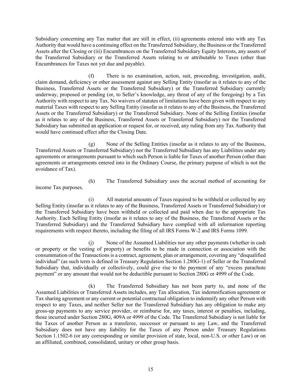 15 Subsidiary concerning any Tax matter that are still in effect, (ii) agreements entered into with any Tax Authority that would have a continuing effect on the Transferred Subsidiary, the Business or the Transferred Assets after the Closing or (iii) Encumbrances on the Transferred Subsidiary Equity Interests, any assets of the Transferred Subsidiary or the Transferred Assets relating to or attributable to Taxes (other than Encumbrances for Taxes not yet due and payable). (f) There is no examination, action, suit, proceeding, investigation, audit, claim demand, deficiency or other assessment against any Selling Entity (insofar as it relates to any of the Business, Transferred Assets or the Transferred Subsidiary) or the Transferred Subsidiary currently underway, proposed or pending (or, to Seller’s knowledge, any threat of any of the foregoing) by a Tax Authority with respect to any Tax. No waivers of statutes of limitations have been given with respect to any material Taxes with respect to any Selling Entity (insofar as it relates to any of the Business, the Transferred Assets or the Transferred Subsidiary) or the Transferred Subsidiary. None of the Selling Entities (insofar as it relates to any of the Business, Transferred Assets or Transferred Subsidiary) nor the Transferred Subsidiary has submitted an application or request for, or received, any ruling from any Tax Authority that would have continued effect after the Closing Date. (g) None of the Selling Entities (insofar as it relates to any of the Business, Transferred Assets or Transferred Subsidiary) nor the Transferred Subsidiary has any Liabilities under any agreements or arrangements pursuant to which such Person is liable for Taxes of another Person (other than agreements or arrangements entered into in the Ordinary Course, the primary purpose of which is not the avoidance of Tax). (h) The Transferred Subsidiary uses the accrual method of accounting for income Tax purposes. (i) All material amounts of Taxes required to be withheld or collected by any Selling Entity (insofar as it relates to any of the Business, Transferred Assets or Transferred Subsidiary) or the Transferred Subsidiary have been withheld or collected and paid when due to the appropriate Tax Authority. Each Selling Entity (insofar as it relates to any of the Business, the Transferred Assets or the Transferred Subsidiary) and the Transferred Subsidiary have complied with all information reporting requirements with respect thereto, including the filing of all IRS Forms W-2 and IRS Forms 1099. (j) None of the Assumed Liabilities nor any other payments (whether in cash or property or the vesting of property) or benefits to be made in connection or association with the consummation of the Transactions is a contract, agreement, plan or arrangement, covering any “disqualified individual” (as such term is defined in Treasury Regulation Section 1.280G-1) of Seller or the Transferred Subsidiary that, individually or collectively, could give rise to the payment of any “excess parachute payment” or any amount that would not be deductible pursuant to Section 280G or 4999 of the Code. (k) The Transferred Subsidiary has not been party to, and none of the Assumed Liabilities or Transferred Assets includes, any Tax allocation, Tax indemnification agreement or Tax sharing agreement or any current or potential contractual obligation to indemnify any other Person with respect to any Taxes, and neither Seller nor the Transferred Subsidiary has any obligation to make any gross-up payments to any service provider, or reimburse for, any taxes, interest or penalties, including, those incurred under Section 280G, 409A or 4999 of the Code. The Transferred Subsidiary is not liable for the Taxes of another Person as a transferee, successor or pursuant to any Law, and the Transferred Subsidiary does not have any liability for the Taxes of any Person under Treasury Regulations Section 1.1502-6 (or any corresponding or similar provision of state, local, non-U.S. or other Law) or on an affiliated, combined, consolidated, unitary or other group basis.