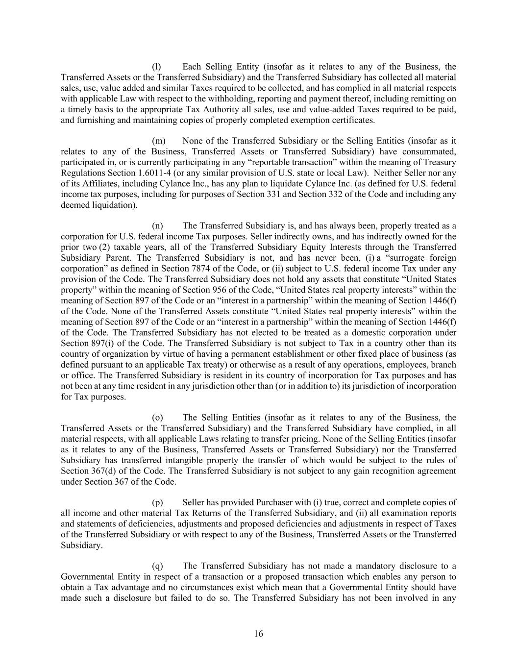 16 (l) Each Selling Entity (insofar as it relates to any of the Business, the Transferred Assets or the Transferred Subsidiary) and the Transferred Subsidiary has collected all material sales, use, value added and similar Taxes required to be collected, and has complied in all material respects with applicable Law with respect to the withholding, reporting and payment thereof, including remitting on a timely basis to the appropriate Tax Authority all sales, use and value-added Taxes required to be paid, and furnishing and maintaining copies of properly completed exemption certificates. (m) None of the Transferred Subsidiary or the Selling Entities (insofar as it relates to any of the Business, Transferred Assets or Transferred Subsidiary) have consummated, participated in, or is currently participating in any “reportable transaction” within the meaning of Treasury Regulations Section 1.6011-4 (or any similar provision of U.S. state or local Law). Neither Seller nor any of its Affiliates, including Cylance Inc., has any plan to liquidate Cylance Inc. (as defined for U.S. federal income tax purposes, including for purposes of Section 331 and Section 332 of the Code and including any deemed liquidation). (n) The Transferred Subsidiary is, and has always been, properly treated as a corporation for U.S. federal income Tax purposes. Seller indirectly owns, and has indirectly owned for the prior two (2) taxable years, all of the Transferred Subsidiary Equity Interests through the Transferred Subsidiary Parent. The Transferred Subsidiary is not, and has never been, (i) a “surrogate foreign corporation” as defined in Section 7874 of the Code, or (ii) subject to U.S. federal income Tax under any provision of the Code. The Transferred Subsidiary does not hold any assets that constitute “United States property” within the meaning of Section 956 of the Code, “United States real property interests” within the meaning of Section 897 of the Code or an “interest in a partnership” within the meaning of Section 1446(f) of the Code. None of the Transferred Assets constitute “United States real property interests” within the meaning of Section 897 of the Code or an “interest in a partnership” within the meaning of Section 1446(f) of the Code. The Transferred Subsidiary has not elected to be treated as a domestic corporation under Section 897(i) of the Code. The Transferred Subsidiary is not subject to Tax in a country other than its country of organization by virtue of having a permanent establishment or other fixed place of business (as defined pursuant to an applicable Tax treaty) or otherwise as a result of any operations, employees, branch or office. The Transferred Subsidiary is resident in its country of incorporation for Tax purposes and has not been at any time resident in any jurisdiction other than (or in addition to) its jurisdiction of incorporation for Tax purposes. (o) The Selling Entities (insofar as it relates to any of the Business, the Transferred Assets or the Transferred Subsidiary) and the Transferred Subsidiary have complied, in all material respects, with all applicable Laws relating to transfer pricing. None of the Selling Entities (insofar as it relates to any of the Business, Transferred Assets or Transferred Subsidiary) nor the Transferred Subsidiary has transferred intangible property the transfer of which would be subject to the rules of Section 367(d) of the Code. The Transferred Subsidiary is not subject to any gain recognition agreement under Section 367 of the Code. (p) Seller has provided Purchaser with (i) true, correct and complete copies of all income and other material Tax Returns of the Transferred Subsidiary, and (ii) all examination reports and statements of deficiencies, adjustments and proposed deficiencies and adjustments in respect of Taxes of the Transferred Subsidiary or with respect to any of the Business, Transferred Assets or the Transferred Subsidiary. (q) The Transferred Subsidiary has not made a mandatory disclosure to a Governmental Entity in respect of a transaction or a proposed transaction which enables any person to obtain a Tax advantage and no circumstances exist which mean that a Governmental Entity should have made such a disclosure but failed to do so. The Transferred Subsidiary has not been involved in any