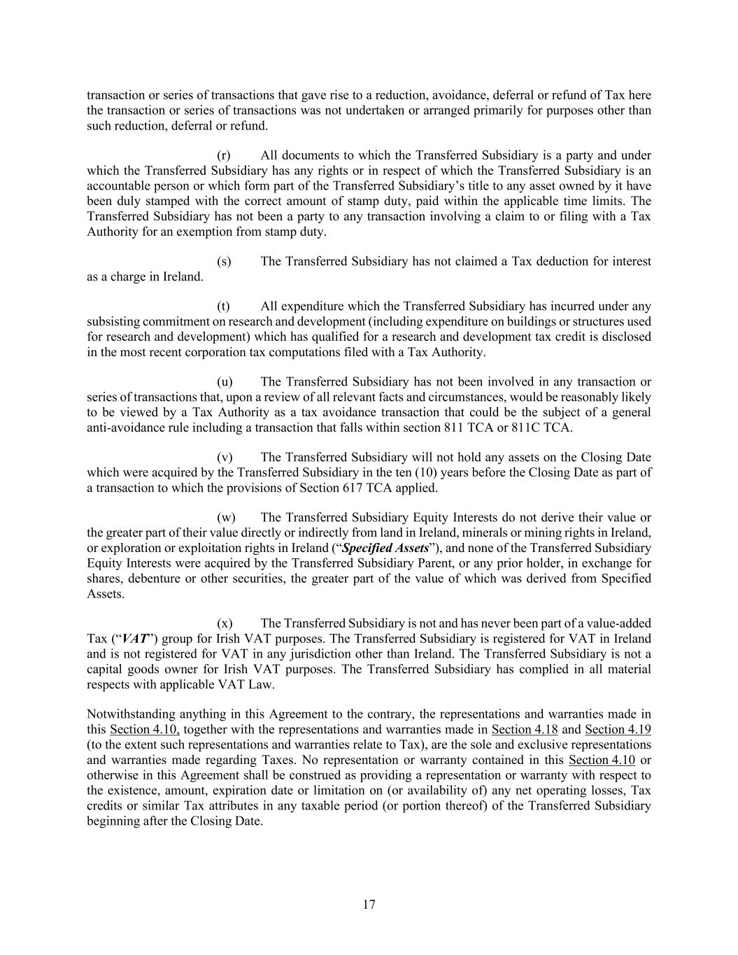 17 transaction or series of transactions that gave rise to a reduction, avoidance, deferral or refund of Tax here the transaction or series of transactions was not undertaken or arranged primarily for purposes other than such reduction, deferral or refund. (r) All documents to which the Transferred Subsidiary is a party and under which the Transferred Subsidiary has any rights or in respect of which the Transferred Subsidiary is an accountable person or which form part of the Transferred Subsidiary’s title to any asset owned by it have been duly stamped with the correct amount of stamp duty, paid within the applicable time limits. The Transferred Subsidiary has not been a party to any transaction involving a claim to or filing with a Tax Authority for an exemption from stamp duty. (s) The Transferred Subsidiary has not claimed a Tax deduction for interest as a charge in Ireland. (t) All expenditure which the Transferred Subsidiary has incurred under any subsisting commitment on research and development (including expenditure on buildings or structures used for research and development) which has qualified for a research and development tax credit is disclosed in the most recent corporation tax computations filed with a Tax Authority. (u) The Transferred Subsidiary has not been involved in any transaction or series of transactions that, upon a review of all relevant facts and circumstances, would be reasonably likely to be viewed by a Tax Authority as a tax avoidance transaction that could be the subject of a general anti-avoidance rule including a transaction that falls within section 811 TCA or 811C TCA. (v) The Transferred Subsidiary will not hold any assets on the Closing Date which were acquired by the Transferred Subsidiary in the ten (10) years before the Closing Date as part of a transaction to which the provisions of Section 617 TCA applied. (w) The Transferred Subsidiary Equity Interests do not derive their value or the greater part of their value directly or indirectly from land in Ireland, minerals or mining rights in Ireland, or exploration or exploitation rights in Ireland (“Specified Assets”), and none of the Transferred Subsidiary Equity Interests were acquired by the Transferred Subsidiary Parent, or any prior holder, in exchange for shares, debenture or other securities, the greater part of the value of which was derived from Specified Assets. (x) The Transferred Subsidiary is not and has never been part of a value-added Tax (“VAT”) group for Irish VAT purposes. The Transferred Subsidiary is registered for VAT in Ireland and is not registered for VAT in any jurisdiction other than Ireland. The Transferred Subsidiary is not a capital goods owner for Irish VAT purposes. The Transferred Subsidiary has complied in all material respects with applicable VAT Law. Notwithstanding anything in this Agreement to the contrary, the representations and warranties made in this Section 4.10, together with the representations and warranties made in Section 4.18 and Section 4.19 (to the extent such representations and warranties relate to Tax), are the sole and exclusive representations and warranties made regarding Taxes. No representation or warranty contained in this Section 4.10 or otherwise in this Agreement shall be construed as providing a representation or warranty with respect to the existence, amount, expiration date or limitation on (or availability of) any net operating losses, Tax credits or similar Tax attributes in any taxable period (or portion thereof) of the Transferred Subsidiary beginning after the Closing Date.