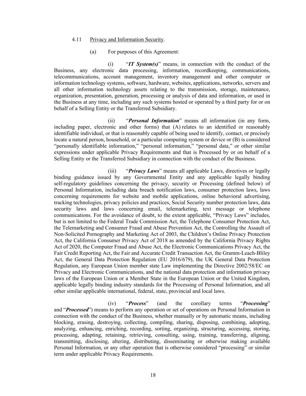 18 4.11 Privacy and Information Security. (a) For purposes of this Agreement: (i) “IT System(s)” means, in connection with the conduct of the Business, any electronic data processing, information, recordkeeping, communications, telecommunications, account management, inventory management and other computer or information technology systems, software, hardware, websites, applications, networks, servers and all other information technology assets relating to the transmission, storage, maintenance, organization, presentation, generation, processing or analysis of data and information, or used in the Business at any time, including any such systems hosted or operated by a third party for or on behalf of a Selling Entity or the Transferred Subsidiary. (ii) “Personal Information” means all information (in any form, including paper, electronic and other forms) that (A) relates to an identified or reasonably identifiable individual, or that is reasonably capable of being used to identify, contact, or precisely locate a natural person, household, or a particular computing system or device or (B) is considered “personally identifiable information,” “personal information,” “personal data,” or other similar expressions under applicable Privacy Requirements and that is Processed by or on behalf of a Selling Entity or the Transferred Subsidiary in connection with the conduct of the Business. (iii) “Privacy Laws” means all applicable Laws, directives or legally binding guidance issued by any Governmental Entity and any applicable legally binding self-regulatory guidelines concerning the privacy, security or Processing (defined below) of Personal Information, including data breach notification laws, consumer protection laws, laws concerning requirements for website and mobile applications, online behavioral advertising, tracking technologies, privacy policies and practices, Social Security number protection laws, data security laws and laws concerning email, telemarketing, text message or telephone communications. For the avoidance of doubt, to the extent applicable, “Privacy Laws” includes, but is not limited to the Federal Trade Commission Act, the Telephone Consumer Protection Act, the Telemarketing and Consumer Fraud and Abuse Prevention Act, the Controlling the Assault of Non-Solicited Pornography and Marketing Act of 2003, the Children’s Online Privacy Protection Act, the California Consumer Privacy Act of 2018 as amended by the California Privacy Rights Act of 2020, the Computer Fraud and Abuse Act, the Electronic Communications Privacy Act, the Fair Credit Reporting Act, the Fair and Accurate Credit Transaction Act, the Gramm-Leach-Bliley Act, the General Data Protection Regulation (EU 2016/679), the UK General Data Protection Regulation, any European Union member state Law implementing the Directive 2002/58/EC on Privacy and Electronic Communications, and the national data protection and information privacy laws of the European Union or a Member State in the European Union or the United Kingdom, applicable legally binding industry standards for the Processing of Personal Information, and all other similar applicable international, federal, state, provincial and local laws. (iv) “Process” (and the corollary terms “Processing” and “Processed”) means to perform any operation or set of operations on Personal Information in connection with the conduct of the Business, whether manually or by automatic means, including blocking, erasing, destroying, collecting, compiling, sharing, disposing, combining, adopting, analyzing, enhancing, enriching, recording, sorting, organizing, structuring, accessing, storing, processing, adapting, retaining, retrieving, consulting, using, training, transferring, aligning, transmitting, disclosing, altering, distributing, disseminating or otherwise making available Personal Information, or any other operation that is otherwise considered “processing” or similar term under applicable Privacy Requirements.