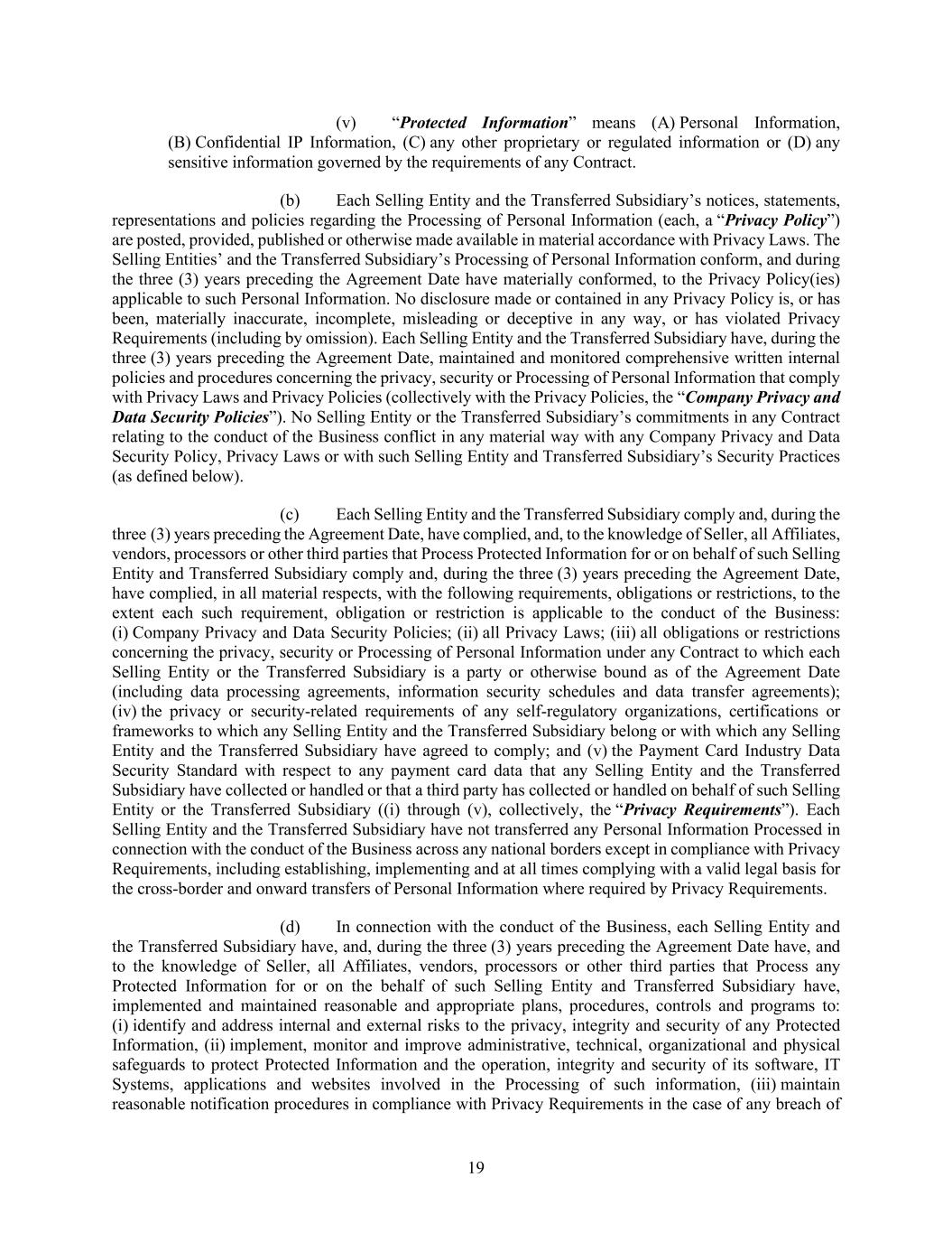 19 (v) “Protected Information” means (A) Personal Information, (B) Confidential IP Information, (C) any other proprietary or regulated information or (D) any sensitive information governed by the requirements of any Contract. (b) Each Selling Entity and the Transferred Subsidiary’s notices, statements, representations and policies regarding the Processing of Personal Information (each, a “Privacy Policy”) are posted, provided, published or otherwise made available in material accordance with Privacy Laws. The Selling Entities’ and the Transferred Subsidiary’s Processing of Personal Information conform, and during the three (3) years preceding the Agreement Date have materially conformed, to the Privacy Policy(ies) applicable to such Personal Information. No disclosure made or contained in any Privacy Policy is, or has been, materially inaccurate, incomplete, misleading or deceptive in any way, or has violated Privacy Requirements (including by omission). Each Selling Entity and the Transferred Subsidiary have, during the three (3) years preceding the Agreement Date, maintained and monitored comprehensive written internal policies and procedures concerning the privacy, security or Processing of Personal Information that comply with Privacy Laws and Privacy Policies (collectively with the Privacy Policies, the “Company Privacy and Data Security Policies”). No Selling Entity or the Transferred Subsidiary’s commitments in any Contract relating to the conduct of the Business conflict in any material way with any Company Privacy and Data Security Policy, Privacy Laws or with such Selling Entity and Transferred Subsidiary’s Security Practices (as defined below). (c) Each Selling Entity and the Transferred Subsidiary comply and, during the three (3) years preceding the Agreement Date, have complied, and, to the knowledge of Seller, all Affiliates, vendors, processors or other third parties that Process Protected Information for or on behalf of such Selling Entity and Transferred Subsidiary comply and, during the three (3) years preceding the Agreement Date, have complied, in all material respects, with the following requirements, obligations or restrictions, to the extent each such requirement, obligation or restriction is applicable to the conduct of the Business: (i) Company Privacy and Data Security Policies; (ii) all Privacy Laws; (iii) all obligations or restrictions concerning the privacy, security or Processing of Personal Information under any Contract to which each Selling Entity or the Transferred Subsidiary is a party or otherwise bound as of the Agreement Date (including data processing agreements, information security schedules and data transfer agreements); (iv) the privacy or security-related requirements of any self-regulatory organizations, certifications or frameworks to which any Selling Entity and the Transferred Subsidiary belong or with which any Selling Entity and the Transferred Subsidiary have agreed to comply; and (v) the Payment Card Industry Data Security Standard with respect to any payment card data that any Selling Entity and the Transferred Subsidiary have collected or handled or that a third party has collected or handled on behalf of such Selling Entity or the Transferred Subsidiary ((i) through (v), collectively, the “Privacy Requirements”). Each Selling Entity and the Transferred Subsidiary have not transferred any Personal Information Processed in connection with the conduct of the Business across any national borders except in compliance with Privacy Requirements, including establishing, implementing and at all times complying with a valid legal basis for the cross-border and onward transfers of Personal Information where required by Privacy Requirements. (d) In connection with the conduct of the Business, each Selling Entity and the Transferred Subsidiary have, and, during the three (3) years preceding the Agreement Date have, and to the knowledge of Seller, all Affiliates, vendors, processors or other third parties that Process any Protected Information for or on the behalf of such Selling Entity and Transferred Subsidiary have, implemented and maintained reasonable and appropriate plans, procedures, controls and programs to: (i) identify and address internal and external risks to the privacy, integrity and security of any Protected Information, (ii) implement, monitor and improve administrative, technical, organizational and physical safeguards to protect Protected Information and the operation, integrity and security of its software, IT Systems, applications and websites involved in the Processing of such information, (iii) maintain reasonable notification procedures in compliance with Privacy Requirements in the case of any breach of