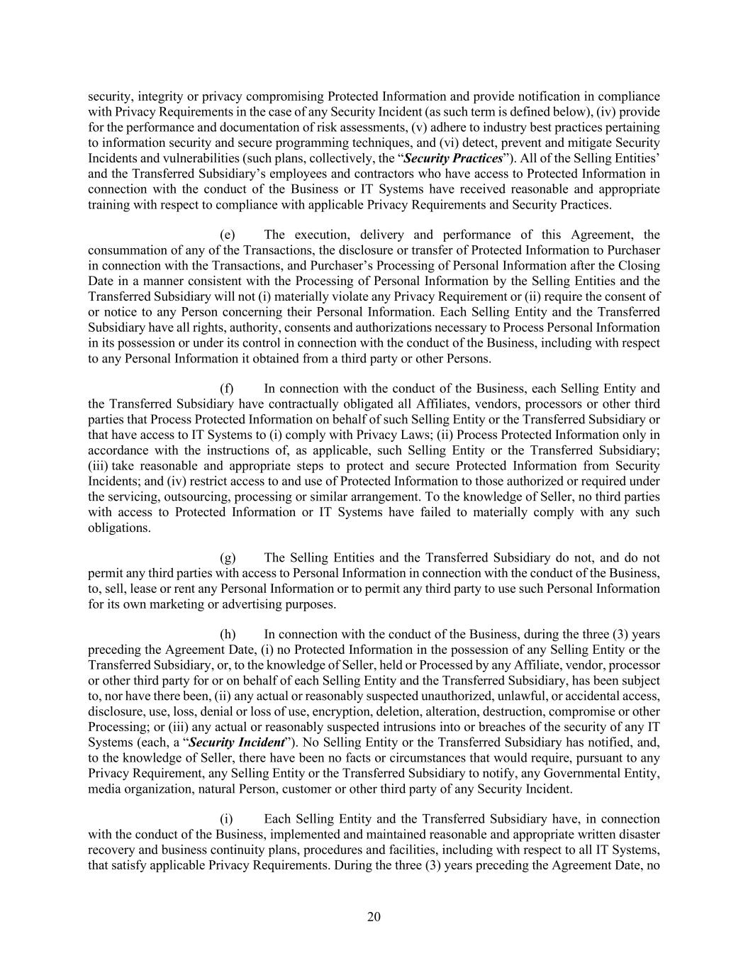 20 security, integrity or privacy compromising Protected Information and provide notification in compliance with Privacy Requirements in the case of any Security Incident (as such term is defined below), (iv) provide for the performance and documentation of risk assessments, (v) adhere to industry best practices pertaining to information security and secure programming techniques, and (vi) detect, prevent and mitigate Security Incidents and vulnerabilities (such plans, collectively, the “Security Practices”). All of the Selling Entities’ and the Transferred Subsidiary’s employees and contractors who have access to Protected Information in connection with the conduct of the Business or IT Systems have received reasonable and appropriate training with respect to compliance with applicable Privacy Requirements and Security Practices. (e) The execution, delivery and performance of this Agreement, the consummation of any of the Transactions, the disclosure or transfer of Protected Information to Purchaser in connection with the Transactions, and Purchaser’s Processing of Personal Information after the Closing Date in a manner consistent with the Processing of Personal Information by the Selling Entities and the Transferred Subsidiary will not (i) materially violate any Privacy Requirement or (ii) require the consent of or notice to any Person concerning their Personal Information. Each Selling Entity and the Transferred Subsidiary have all rights, authority, consents and authorizations necessary to Process Personal Information in its possession or under its control in connection with the conduct of the Business, including with respect to any Personal Information it obtained from a third party or other Persons. (f) In connection with the conduct of the Business, each Selling Entity and the Transferred Subsidiary have contractually obligated all Affiliates, vendors, processors or other third parties that Process Protected Information on behalf of such Selling Entity or the Transferred Subsidiary or that have access to IT Systems to (i) comply with Privacy Laws; (ii) Process Protected Information only in accordance with the instructions of, as applicable, such Selling Entity or the Transferred Subsidiary; (iii) take reasonable and appropriate steps to protect and secure Protected Information from Security Incidents; and (iv) restrict access to and use of Protected Information to those authorized or required under the servicing, outsourcing, processing or similar arrangement. To the knowledge of Seller, no third parties with access to Protected Information or IT Systems have failed to materially comply with any such obligations. (g) The Selling Entities and the Transferred Subsidiary do not, and do not permit any third parties with access to Personal Information in connection with the conduct of the Business, to, sell, lease or rent any Personal Information or to permit any third party to use such Personal Information for its own marketing or advertising purposes. (h) In connection with the conduct of the Business, during the three (3) years preceding the Agreement Date, (i) no Protected Information in the possession of any Selling Entity or the Transferred Subsidiary, or, to the knowledge of Seller, held or Processed by any Affiliate, vendor, processor or other third party for or on behalf of each Selling Entity and the Transferred Subsidiary, has been subject to, nor have there been, (ii) any actual or reasonably suspected unauthorized, unlawful, or accidental access, disclosure, use, loss, denial or loss of use, encryption, deletion, alteration, destruction, compromise or other Processing; or (iii) any actual or reasonably suspected intrusions into or breaches of the security of any IT Systems (each, a “Security Incident”). No Selling Entity or the Transferred Subsidiary has notified, and, to the knowledge of Seller, there have been no facts or circumstances that would require, pursuant to any Privacy Requirement, any Selling Entity or the Transferred Subsidiary to notify, any Governmental Entity, media organization, natural Person, customer or other third party of any Security Incident. (i) Each Selling Entity and the Transferred Subsidiary have, in connection with the conduct of the Business, implemented and maintained reasonable and appropriate written disaster recovery and business continuity plans, procedures and facilities, including with respect to all IT Systems, that satisfy applicable Privacy Requirements. During the three (3) years preceding the Agreement Date, no