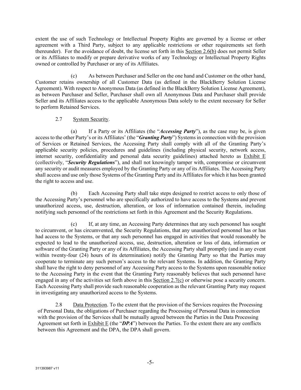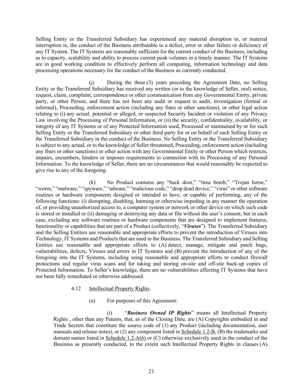 21 Selling Entity or the Transferred Subsidiary has experienced any material disruption to, or material interruption in, the conduct of the Business attributable to a defect, error or other failure or deficiency of any IT System. The IT Systems are reasonably sufficient for the current conduct of the Business, including as to capacity, scalability and ability to process current peak volumes in a timely manner. The IT Systems are in good working condition to effectively perform all computing, information technology and data processing operations necessary for the conduct of the Business as currently conducted. (j) During the three (3) years preceding the Agreement Date, no Selling Entity or the Transferred Subsidiary has received any written (or to the knowledge of Seller, oral) notice, request, claim, complaint, correspondence or other communication from any Governmental Entity, private party, or other Person, and there has not been any audit or request to audit, investigation (formal or informal), Proceeding, enforcement action (including any fines or other sanctions), or other legal action relating to (i) any actual, potential or alleged, or suspected Security Incident or violation of any Privacy Law involving the Processing of Personal Information, or (ii) the security, confidentiality, availability, or integrity of any IT Systems or of any Protected Information used, Processed or maintained by or for such Selling Entity or the Transferred Subsidiary or other third party for or on behalf of such Selling Entity or the Transferred Subsidiary in the conduct of the Business. No Selling Entity or the Transferred Subsidiary is subject to any actual, or to the knowledge of Seller threatened, Proceeding, enforcement action (including any fines or other sanctions) or other action with any Governmental Entity or other Person which restricts, impairs, encumbers, hinders or imposes requirements in connection with its Processing of any Personal Information. To the knowledge of Seller, there are no circumstances that would reasonably be expected to give rise to any of the foregoing. (k) No Product contains any “back door,” “time bomb,” “Trojan horse,” “worm,” “malware,” “spyware,” “adware,” “malicious code,” “drop dead device,” “virus” or other software routines or hardware components designed or intended to have, or capable of performing, any of the following functions: (i) disrupting, disabling, harming or otherwise impeding in any manner the operation of, or providing unauthorized access to, a computer system or network or other device on which such code is stored or installed or (ii) damaging or destroying any data or file without the user’s consent, but in each case, excluding any software routines or hardware components that are designed to implement features, functionality or capabilities that are part of a Product (collectively, “Viruses”). The Transferred Subsidiary and the Selling Entities use reasonable and appropriate efforts to prevent the introduction of Viruses into Technology, IT Systems and Products that are used in the Business. The Transferred Subsidiary and Selling Entities use reasonable and appropriate efforts to (A) detect, manage, mitigate and patch bugs, vulnerabilities, defects, Viruses and errors in IT Systems and (B) prevent the introduction of any of the foregoing into the IT Systems, including using reasonable and appropriate efforts to conduct firewall protections and regular virus scans and for taking and storing on-site and off-site back-up copies of Protected Information. To Seller’s knowledge, there are no vulnerabilities affecting IT Systems that have not been fully remediated or otherwise addressed. 4.12 Intellectual Property Rights. (a) For purposes of this Agreement: (i) “Business Owned IP Rights” means all Intellectual Property Rights , other than any Patents, that, as of the Closing Date, are (A) Copyrights embodied in and Trade Secrets that constitute the source code of (1) any Product (including documentation, user manuals and release notes), or (2) any component listed in Schedule 1.2-B, (B) the trademarks and domain names listed in Schedule 1.2-A(6) or (C) otherwise exclusively used in the conduct of the Business as presently conducted, to the extent such Intellectual Property Rights in clauses (A)