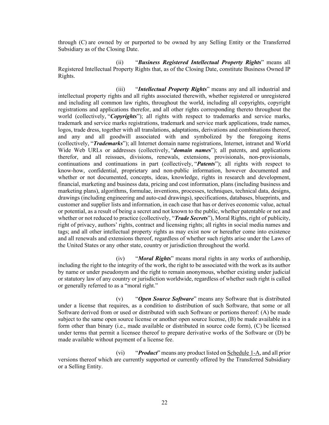 22 through (C) are owned by or purported to be owned by any Selling Entity or the Transferred Subsidiary as of the Closing Date. (ii) “Business Registered Intellectual Property Rights” means all Registered Intellectual Property Rights that, as of the Closing Date, constitute Business Owned IP Rights. (iii) “Intellectual Property Rights” means any and all industrial and intellectual property rights and all rights associated therewith, whether registered or unregistered and including all common law rights, throughout the world, including all copyrights, copyright registrations and applications therefor, and all other rights corresponding thereto throughout the world (collectively, “Copyrights”); all rights with respect to trademarks and service marks, trademark and service marks registrations, trademark and service mark applications, trade names, logos, trade dress, together with all translations, adaptations, derivations and combinations thereof, and any and all goodwill associated with and symbolized by the foregoing items (collectively, “Trademarks”); all Internet domain name registrations, Internet, intranet and World Wide Web URLs or addresses (collectively, “domain names”); all patents, and applications therefor, and all reissues, divisions, renewals, extensions, provisionals, non-provisionals, continuations and continuations in part (collectively, “Patents”); all rights with respect to know-how, confidential, proprietary and non-public information, however documented and whether or not documented, concepts, ideas, knowledge, rights in research and development, financial, marketing and business data, pricing and cost information, plans (including business and marketing plans), algorithms, formulae, inventions, processes, techniques, technical data, designs, drawings (including engineering and auto-cad drawings), specifications, databases, blueprints, and customer and supplier lists and information, in each case that has or derives economic value, actual or potential, as a result of being a secret and not known to the public, whether patentable or not and whether or not reduced to practice (collectively, “Trade Secrets”), Moral Rights, right of publicity, right of privacy, authors’ rights, contract and licensing rights; all rights in social media names and tags; and all other intellectual property rights as may exist now or hereafter come into existence and all renewals and extensions thereof, regardless of whether such rights arise under the Laws of the United States or any other state, country or jurisdiction throughout the world. (iv) “Moral Rights” means moral rights in any works of authorship, including the right to the integrity of the work, the right to be associated with the work as its author by name or under pseudonym and the right to remain anonymous, whether existing under judicial or statutory law of any country or jurisdiction worldwide, regardless of whether such right is called or generally referred to as a “moral right.” (v) “Open Source Software” means any Software that is distributed under a license that requires, as a condition to distribution of such Software, that some or all Software derived from or used or distributed with such Software or portions thereof: (A) be made subject to the same open source license or another open source license, (B) be made available in a form other than binary (i.e., made available or distributed in source code form), (C) be licensed under terms that permit a licensee thereof to prepare derivative works of the Software or (D) be made available without payment of a license fee. (vi) “Product” means any product listed on Schedule 1-A, and all prior versions thereof which are currently supported or currently offered by the Transferred Subsidiary or a Selling Entity.