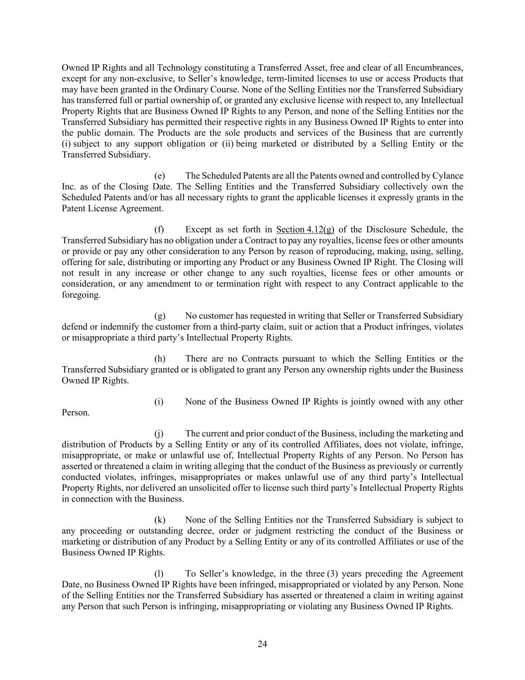 24 Owned IP Rights and all Technology constituting a Transferred Asset, free and clear of all Encumbrances, except for any non-exclusive, to Seller’s knowledge, term-limited licenses to use or access Products that may have been granted in the Ordinary Course. None of the Selling Entities nor the Transferred Subsidiary has transferred full or partial ownership of, or granted any exclusive license with respect to, any Intellectual Property Rights that are Business Owned IP Rights to any Person, and none of the Selling Entities nor the Transferred Subsidiary has permitted their respective rights in any Business Owned IP Rights to enter into the public domain. The Products are the sole products and services of the Business that are currently (i) subject to any support obligation or (ii) being marketed or distributed by a Selling Entity or the Transferred Subsidiary. (e) The Scheduled Patents are all the Patents owned and controlled by Cylance Inc. as of the Closing Date. The Selling Entities and the Transferred Subsidiary collectively own the Scheduled Patents and/or has all necessary rights to grant the applicable licenses it expressly grants in the Patent License Agreement. (f) Except as set forth in Section 4.12(g) of the Disclosure Schedule, the Transferred Subsidiary has no obligation under a Contract to pay any royalties, license fees or other amounts or provide or pay any other consideration to any Person by reason of reproducing, making, using, selling, offering for sale, distributing or importing any Product or any Business Owned IP Right. The Closing will not result in any increase or other change to any such royalties, license fees or other amounts or consideration, or any amendment to or termination right with respect to any Contract applicable to the foregoing. (g) No customer has requested in writing that Seller or Transferred Subsidiary defend or indemnify the customer from a third-party claim, suit or action that a Product infringes, violates or misappropriate a third party’s Intellectual Property Rights. (h) There are no Contracts pursuant to which the Selling Entities or the Transferred Subsidiary granted or is obligated to grant any Person any ownership rights under the Business Owned IP Rights. (i) None of the Business Owned IP Rights is jointly owned with any other Person. (j) The current and prior conduct of the Business, including the marketing and distribution of Products by a Selling Entity or any of its controlled Affiliates, does not violate, infringe, misappropriate, or make or unlawful use of, Intellectual Property Rights of any Person. No Person has asserted or threatened a claim in writing alleging that the conduct of the Business as previously or currently conducted violates, infringes, misappropriates or makes unlawful use of any third party’s Intellectual Property Rights, nor delivered an unsolicited offer to license such third party’s Intellectual Property Rights in connection with the Business. (k) None of the Selling Entities nor the Transferred Subsidiary is subject to any proceeding or outstanding decree, order or judgment restricting the conduct of the Business or marketing or distribution of any Product by a Selling Entity or any of its controlled Affiliates or use of the Business Owned IP Rights. (l) To Seller’s knowledge, in the three (3) years preceding the Agreement Date, no Business Owned IP Rights have been infringed, misappropriated or violated by any Person. None of the Selling Entities nor the Transferred Subsidiary has asserted or threatened a claim in writing against any Person that such Person is infringing, misappropriating or violating any Business Owned IP Rights.