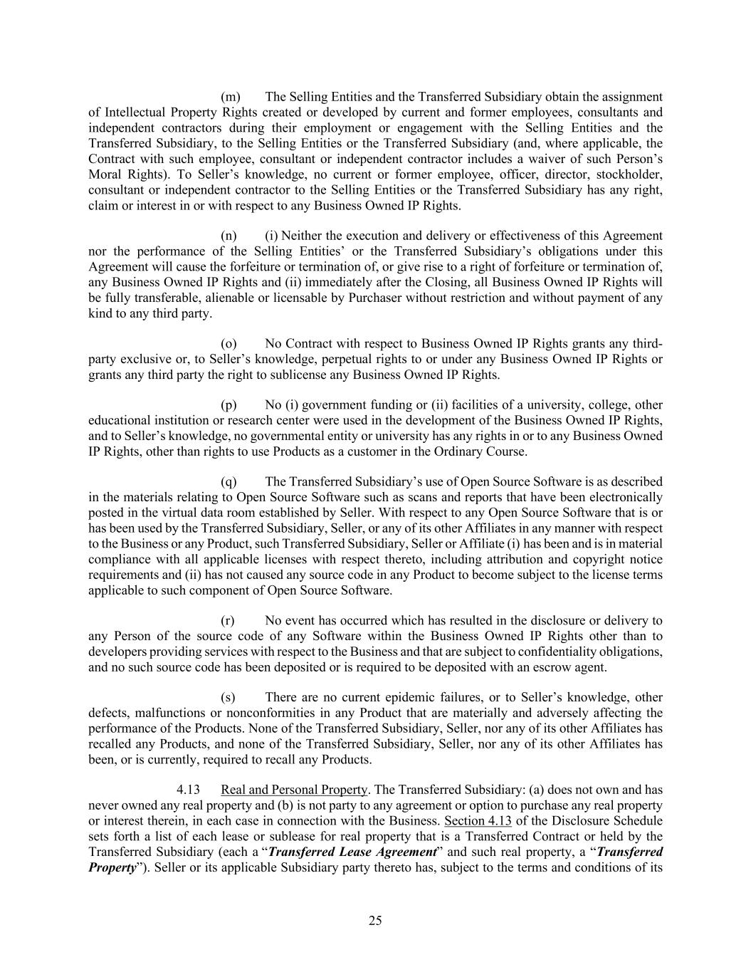 25 (m) The Selling Entities and the Transferred Subsidiary obtain the assignment of Intellectual Property Rights created or developed by current and former employees, consultants and independent contractors during their employment or engagement with the Selling Entities and the Transferred Subsidiary, to the Selling Entities or the Transferred Subsidiary (and, where applicable, the Contract with such employee, consultant or independent contractor includes a waiver of such Person’s Moral Rights). To Seller’s knowledge, no current or former employee, officer, director, stockholder, consultant or independent contractor to the Selling Entities or the Transferred Subsidiary has any right, claim or interest in or with respect to any Business Owned IP Rights. (n) (i) Neither the execution and delivery or effectiveness of this Agreement nor the performance of the Selling Entities’ or the Transferred Subsidiary’s obligations under this Agreement will cause the forfeiture or termination of, or give rise to a right of forfeiture or termination of, any Business Owned IP Rights and (ii) immediately after the Closing, all Business Owned IP Rights will be fully transferable, alienable or licensable by Purchaser without restriction and without payment of any kind to any third party. (o) No Contract with respect to Business Owned IP Rights grants any third- party exclusive or, to Seller’s knowledge, perpetual rights to or under any Business Owned IP Rights or grants any third party the right to sublicense any Business Owned IP Rights. (p) No (i) government funding or (ii) facilities of a university, college, other educational institution or research center were used in the development of the Business Owned IP Rights, and to Seller’s knowledge, no governmental entity or university has any rights in or to any Business Owned IP Rights, other than rights to use Products as a customer in the Ordinary Course. (q) The Transferred Subsidiary’s use of Open Source Software is as described in the materials relating to Open Source Software such as scans and reports that have been electronically posted in the virtual data room established by Seller. With respect to any Open Source Software that is or has been used by the Transferred Subsidiary, Seller, or any of its other Affiliates in any manner with respect to the Business or any Product, such Transferred Subsidiary, Seller or Affiliate (i) has been and is in material compliance with all applicable licenses with respect thereto, including attribution and copyright notice requirements and (ii) has not caused any source code in any Product to become subject to the license terms applicable to such component of Open Source Software. (r) No event has occurred which has resulted in the disclosure or delivery to any Person of the source code of any Software within the Business Owned IP Rights other than to developers providing services with respect to the Business and that are subject to confidentiality obligations, and no such source code has been deposited or is required to be deposited with an escrow agent. (s) There are no current epidemic failures, or to Seller’s knowledge, other defects, malfunctions or nonconformities in any Product that are materially and adversely affecting the performance of the Products. None of the Transferred Subsidiary, Seller, nor any of its other Affiliates has recalled any Products, and none of the Transferred Subsidiary, Seller, nor any of its other Affiliates has been, or is currently, required to recall any Products. 4.13 Real and Personal Property. The Transferred Subsidiary: (a) does not own and has never owned any real property and (b) is not party to any agreement or option to purchase any real property or interest therein, in each case in connection with the Business. Section 4.13 of the Disclosure Schedule sets forth a list of each lease or sublease for real property that is a Transferred Contract or held by the Transferred Subsidiary (each a “Transferred Lease Agreement” and such real property, a “Transferred Property”). Seller or its applicable Subsidiary party thereto has, subject to the terms and conditions of its