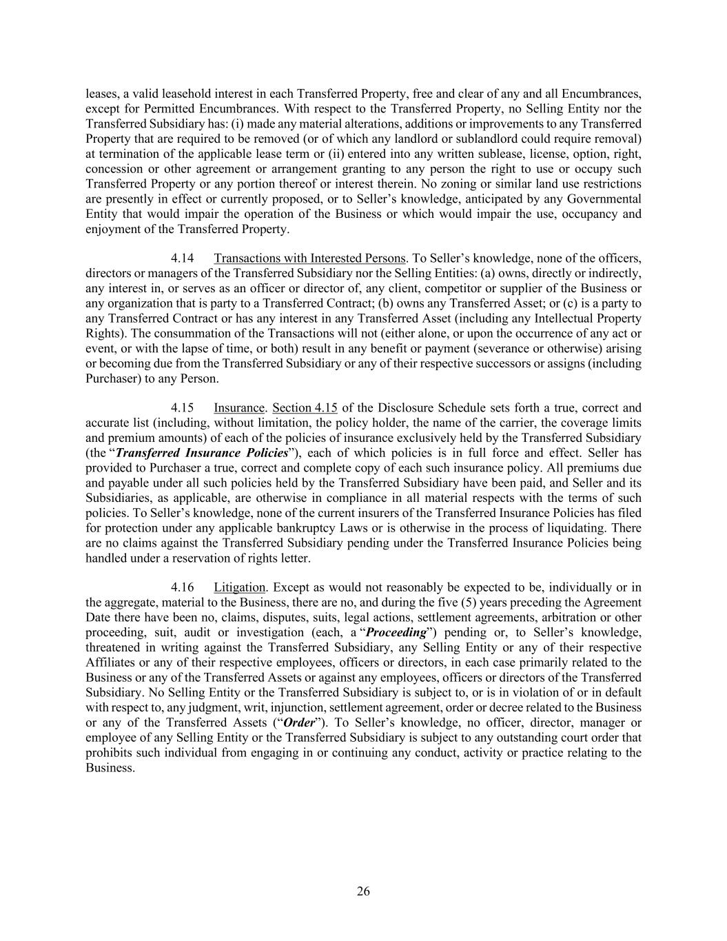 26 leases, a valid leasehold interest in each Transferred Property, free and clear of any and all Encumbrances, except for Permitted Encumbrances. With respect to the Transferred Property, no Selling Entity nor the Transferred Subsidiary has: (i) made any material alterations, additions or improvements to any Transferred Property that are required to be removed (or of which any landlord or sublandlord could require removal) at termination of the applicable lease term or (ii) entered into any written sublease, license, option, right, concession or other agreement or arrangement granting to any person the right to use or occupy such Transferred Property or any portion thereof or interest therein. No zoning or similar land use restrictions are presently in effect or currently proposed, or to Seller’s knowledge, anticipated by any Governmental Entity that would impair the operation of the Business or which would impair the use, occupancy and enjoyment of the Transferred Property. 4.14 Transactions with Interested Persons. To Seller’s knowledge, none of the officers, directors or managers of the Transferred Subsidiary nor the Selling Entities: (a) owns, directly or indirectly, any interest in, or serves as an officer or director of, any client, competitor or supplier of the Business or any organization that is party to a Transferred Contract; (b) owns any Transferred Asset; or (c) is a party to any Transferred Contract or has any interest in any Transferred Asset (including any Intellectual Property Rights). The consummation of the Transactions will not (either alone, or upon the occurrence of any act or event, or with the lapse of time, or both) result in any benefit or payment (severance or otherwise) arising or becoming due from the Transferred Subsidiary or any of their respective successors or assigns (including Purchaser) to any Person. 4.15 Insurance. Section 4.15 of the Disclosure Schedule sets forth a true, correct and accurate list (including, without limitation, the policy holder, the name of the carrier, the coverage limits and premium amounts) of each of the policies of insurance exclusively held by the Transferred Subsidiary (the “Transferred Insurance Policies”), each of which policies is in full force and effect. Seller has provided to Purchaser a true, correct and complete copy of each such insurance policy. All premiums due and payable under all such policies held by the Transferred Subsidiary have been paid, and Seller and its Subsidiaries, as applicable, are otherwise in compliance in all material respects with the terms of such policies. To Seller’s knowledge, none of the current insurers of the Transferred Insurance Policies has filed for protection under any applicable bankruptcy Laws or is otherwise in the process of liquidating. There are no claims against the Transferred Subsidiary pending under the Transferred Insurance Policies being handled under a reservation of rights letter. 4.16 Litigation. Except as would not reasonably be expected to be, individually or in the aggregate, material to the Business, there are no, and during the five (5) years preceding the Agreement Date there have been no, claims, disputes, suits, legal actions, settlement agreements, arbitration or other proceeding, suit, audit or investigation (each, a “Proceeding”) pending or, to Seller’s knowledge, threatened in writing against the Transferred Subsidiary, any Selling Entity or any of their respective Affiliates or any of their respective employees, officers or directors, in each case primarily related to the Business or any of the Transferred Assets or against any employees, officers or directors of the Transferred Subsidiary. No Selling Entity or the Transferred Subsidiary is subject to, or is in violation of or in default with respect to, any judgment, writ, injunction, settlement agreement, order or decree related to the Business or any of the Transferred Assets (“Order”). To Seller’s knowledge, no officer, director, manager or employee of any Selling Entity or the Transferred Subsidiary is subject to any outstanding court order that prohibits such individual from engaging in or continuing any conduct, activity or practice relating to the Business.